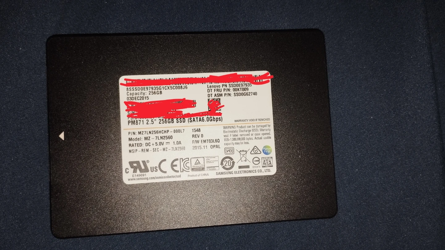 This is a Lenovo 256GB PM871 SATA solid state drive. It's a 2.5-inch drive with a SATA 6.0Gbps interface. This drive was manufactured in 2015.