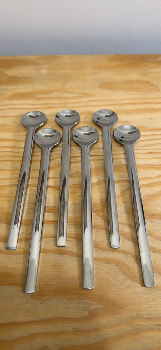 This is a set of six stainless steel spoons. They appear to be cocktail or dessert spoons. The spoons are made of polished stainless steel.