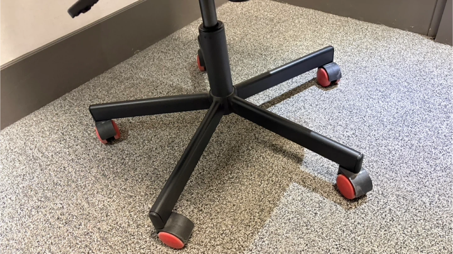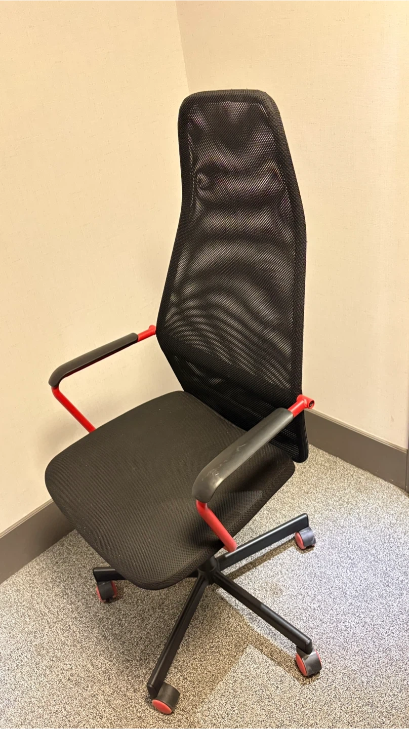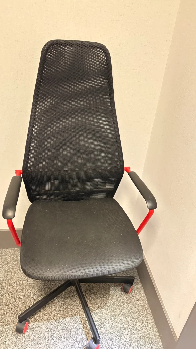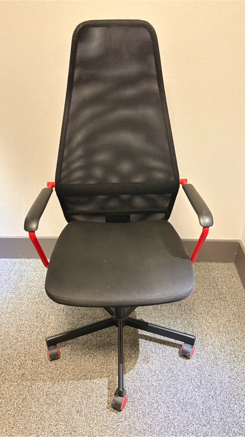This is a black mesh office chair featuring red accents on the armrests and base. It has a breathable mesh back and a comfortable padded seat. Its five-wheel base ensures stability and easy mobility across your workspace.