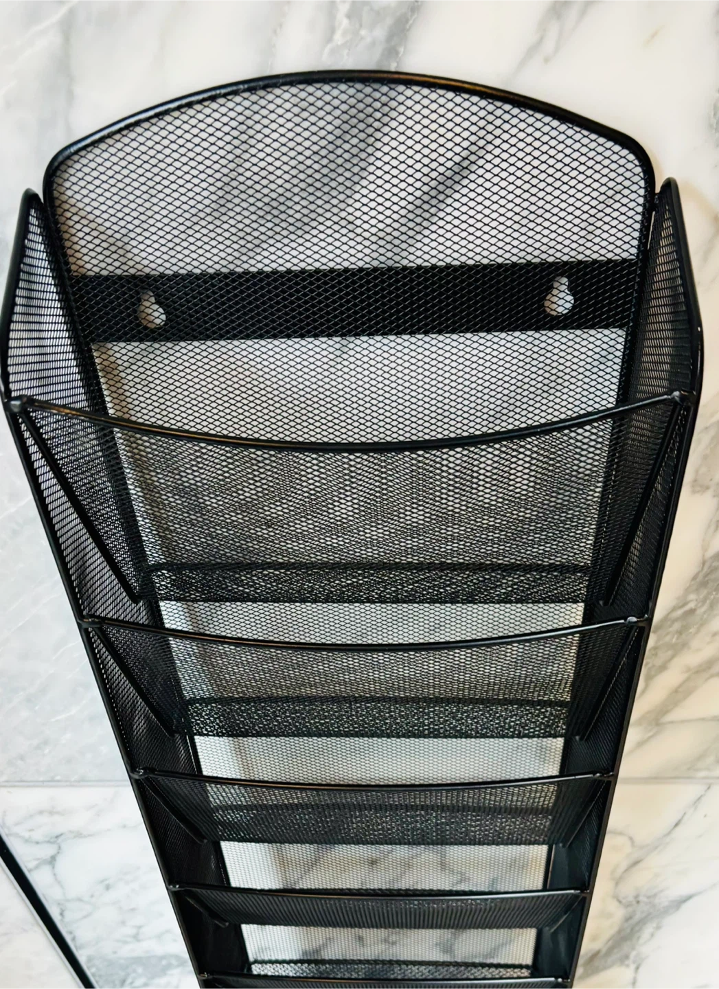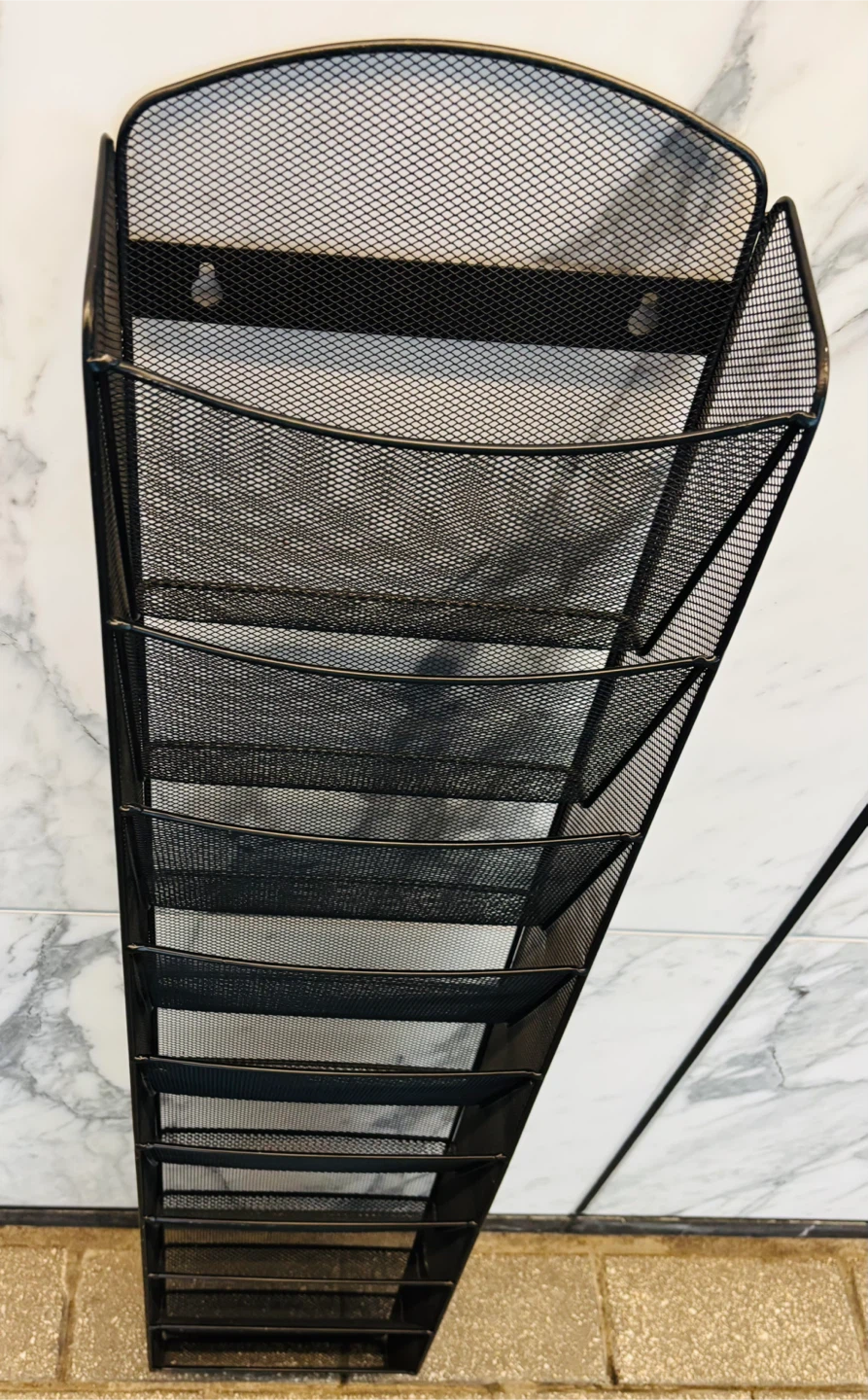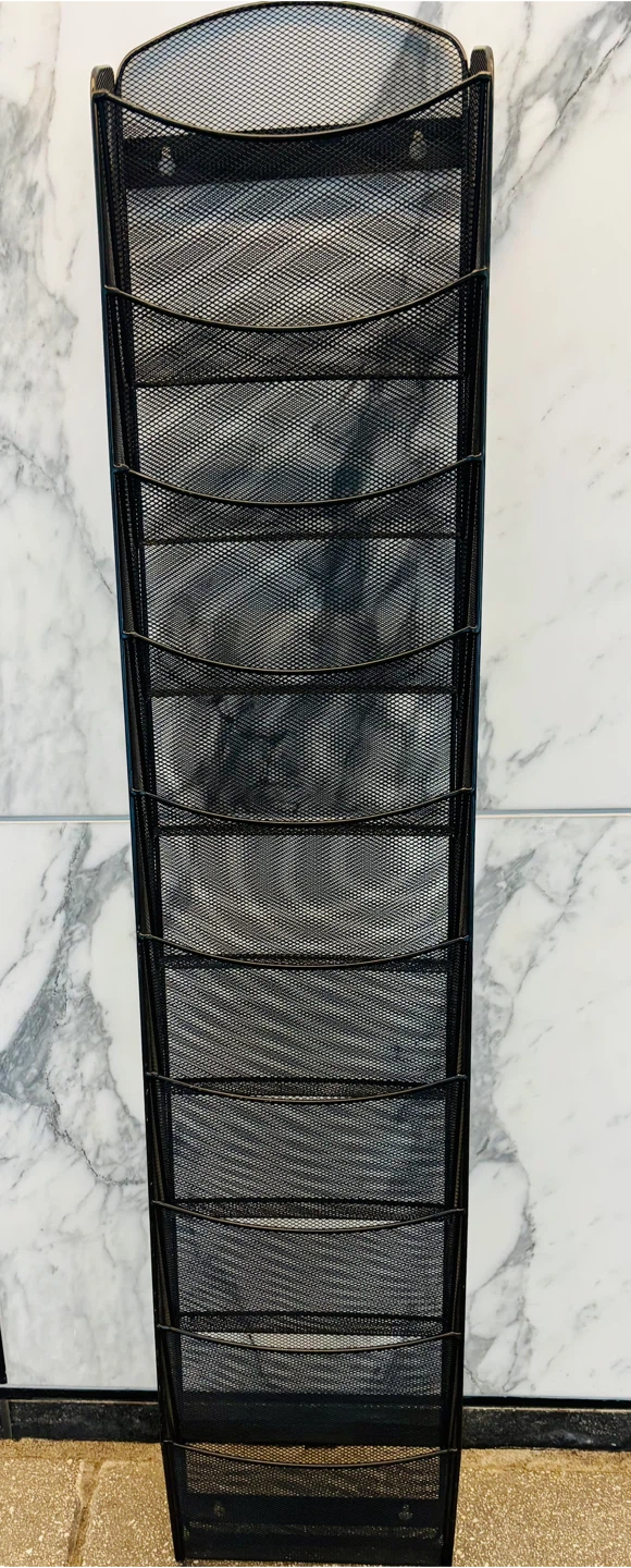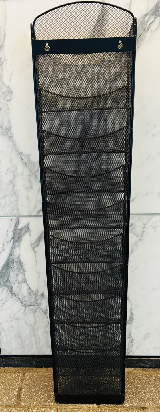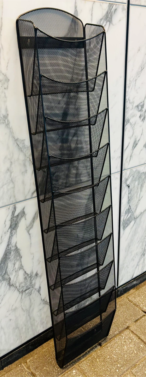 Selling a black metal mesh wall magazine display rack. It has multiple tiers for holding magazines, brochures, or other documents. It's in good condition and ready to organize your space!
