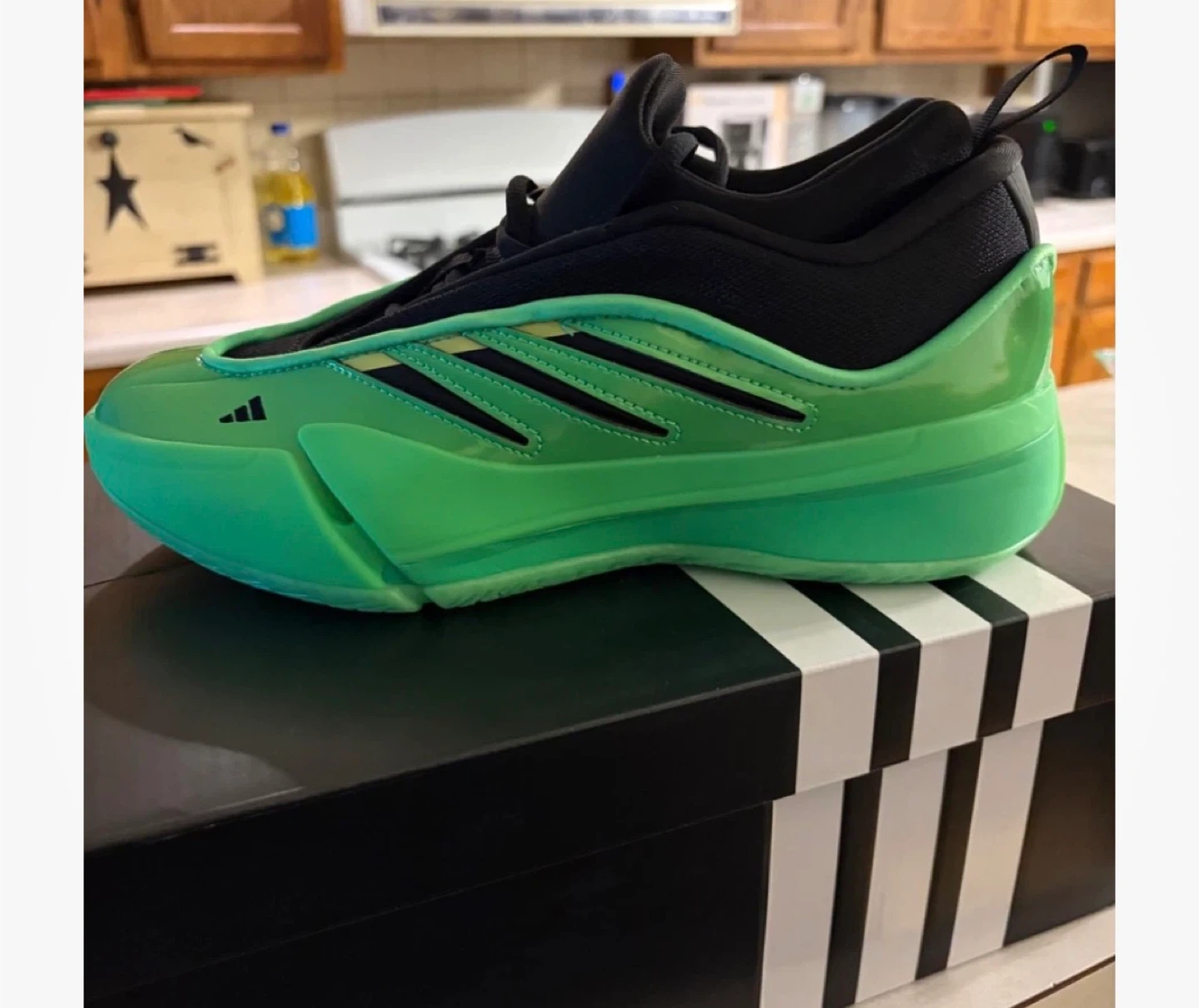 These Adidas Dame 8 basketball shoes come in a vibrant lime green and black colorway. They feature a responsive cushioning system for optimal performance on the court. The lace-up closure ensures a secure fit. Includes original box!