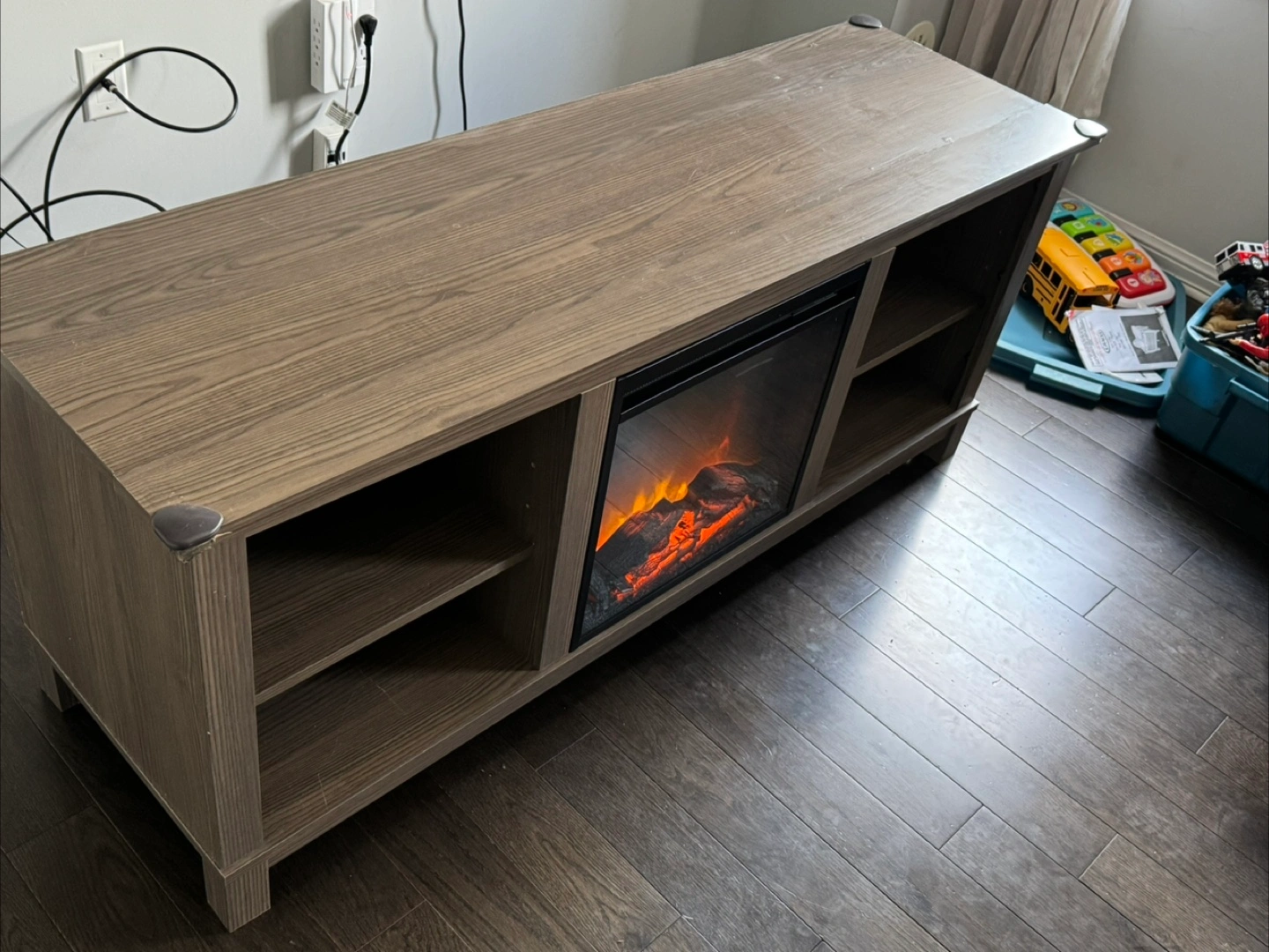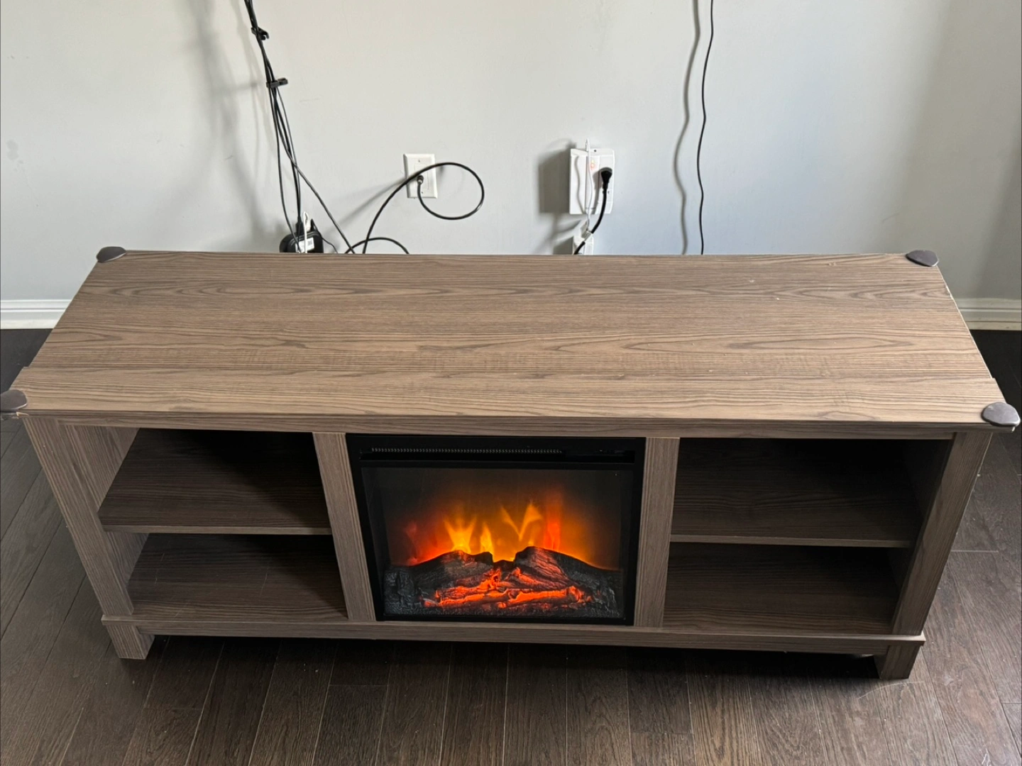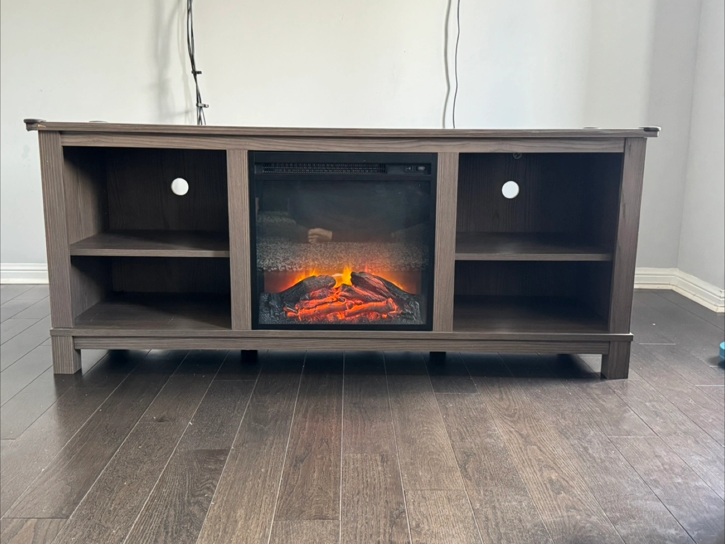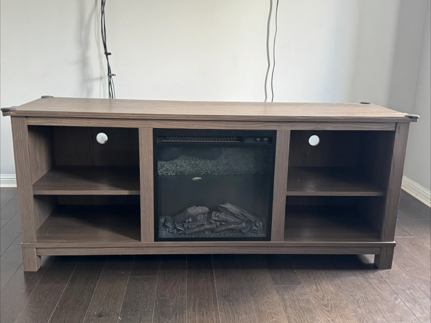 Brown woodgrain finish. Built-in electric fireplace. Multiple shelves for storage. Good condition. Some minor wear.
