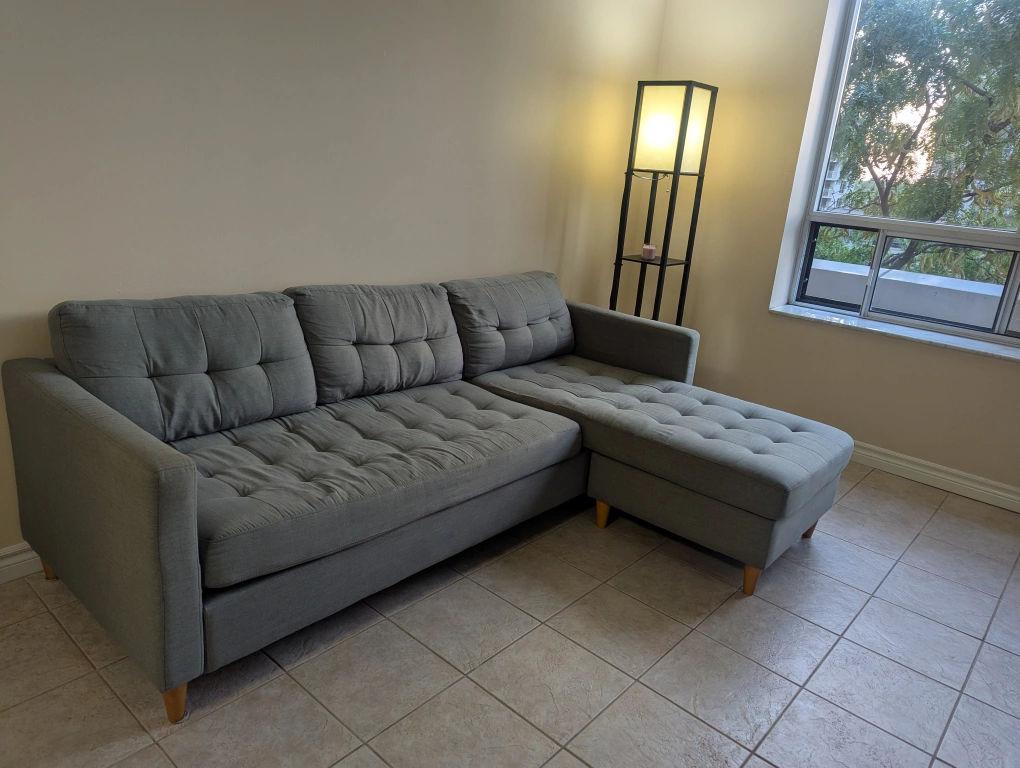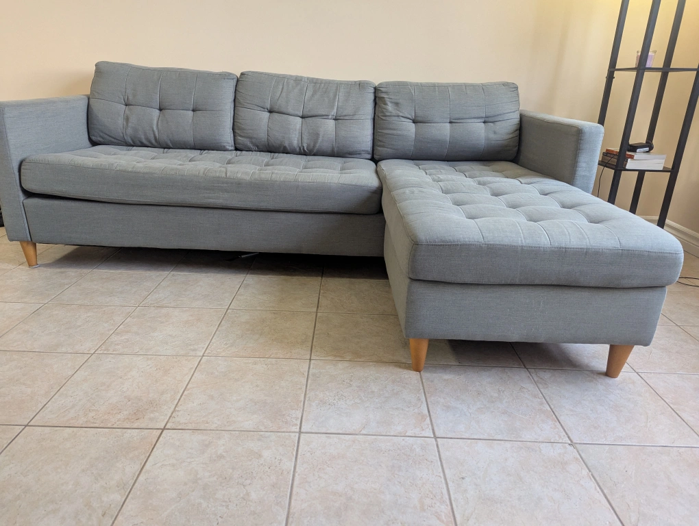 Selling a comfy grey sectional sofa with an ottoman. It's in great condition and would be a perfect addition to any living room! The sectional design allows for flexible arrangement, and the ottoman provides extra seating or a place to kick up your feet after a long day
