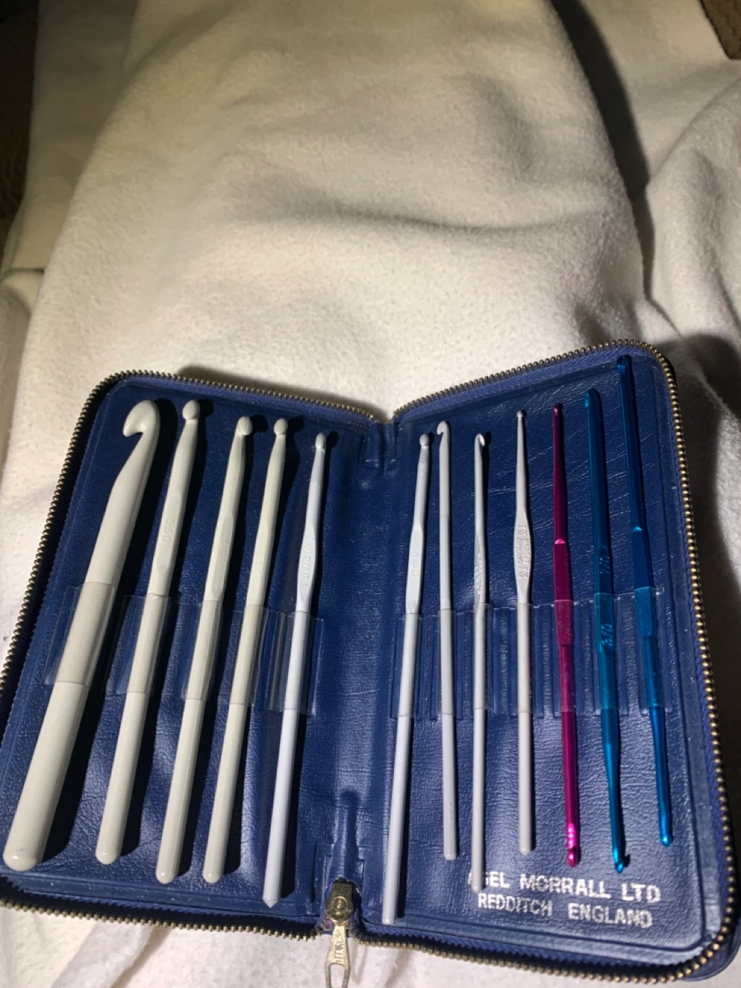 A set of crochet hooks in a blue case. Includes various sizes of hooks made from plastic and metal. Sizes from 10 mm down to about 2 mm.