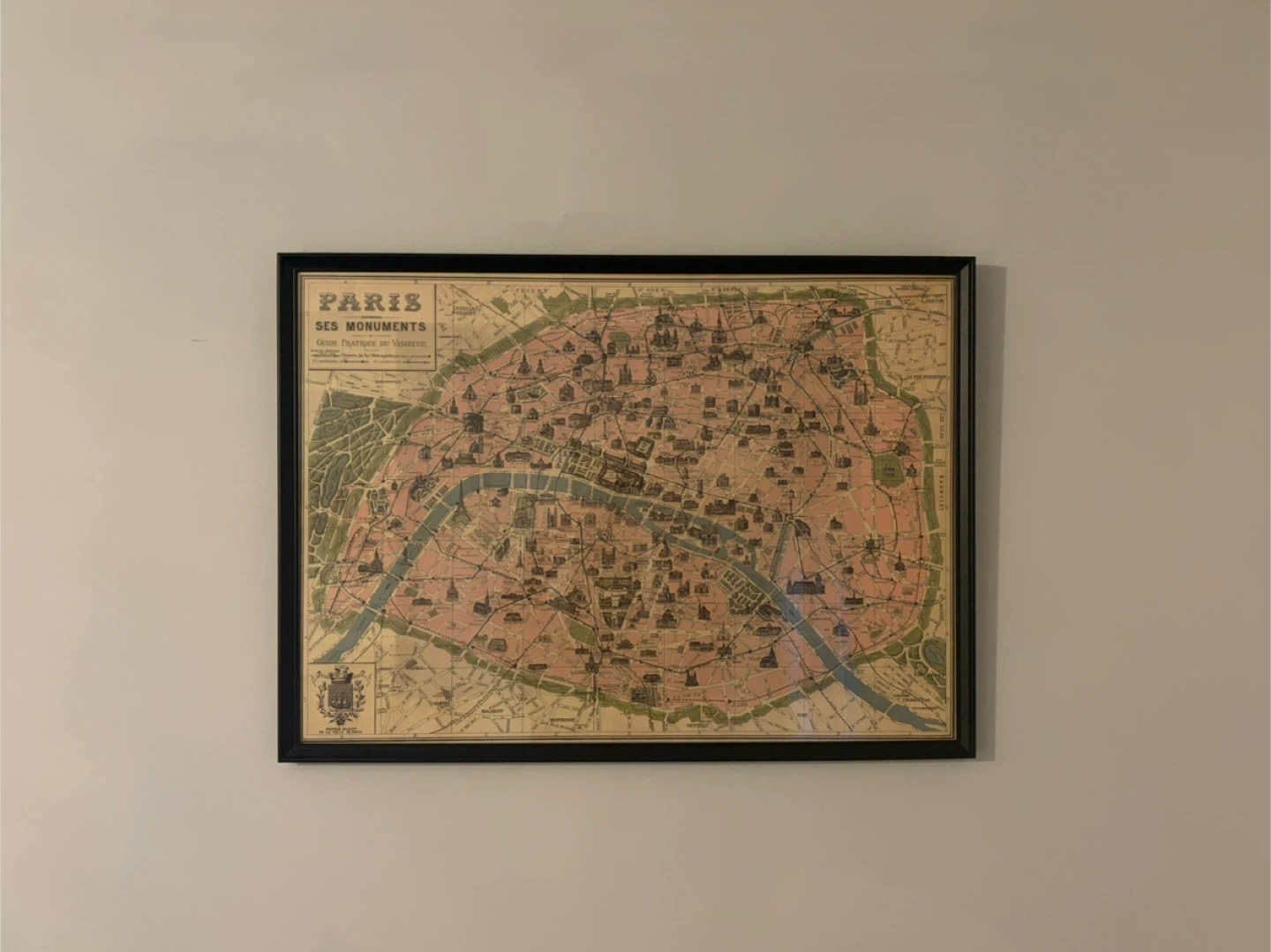 This framed map of Paris shows "Ses Monuments" with a "Guide Pratique du Visiteur". It's a vintage-style depiction of the city's landmarks.