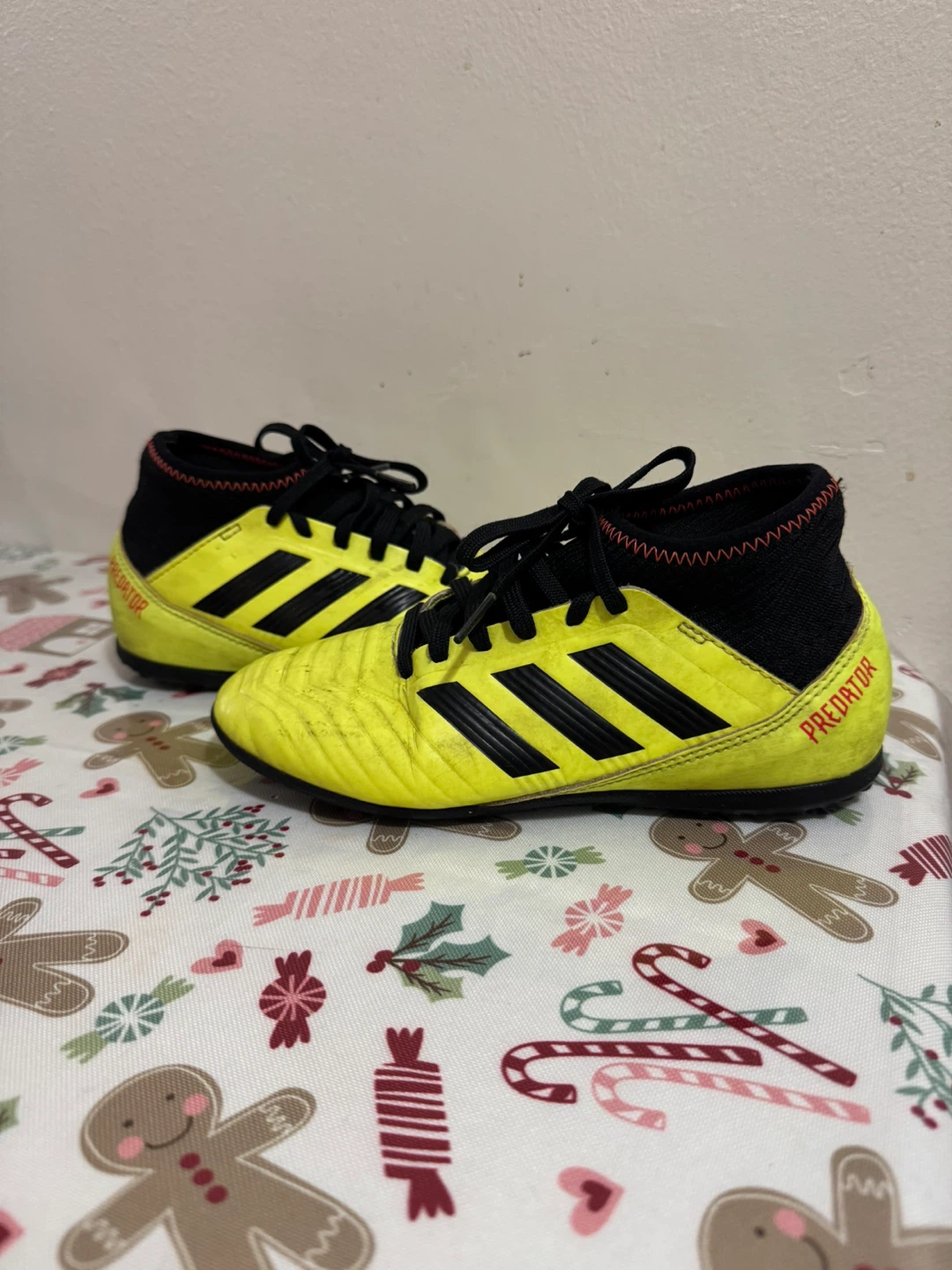 Yellow and black Adidas Predator soccer cleats. These cleats are designed for youth players and feature the iconic three stripes. The Predator branding is visible on the side.