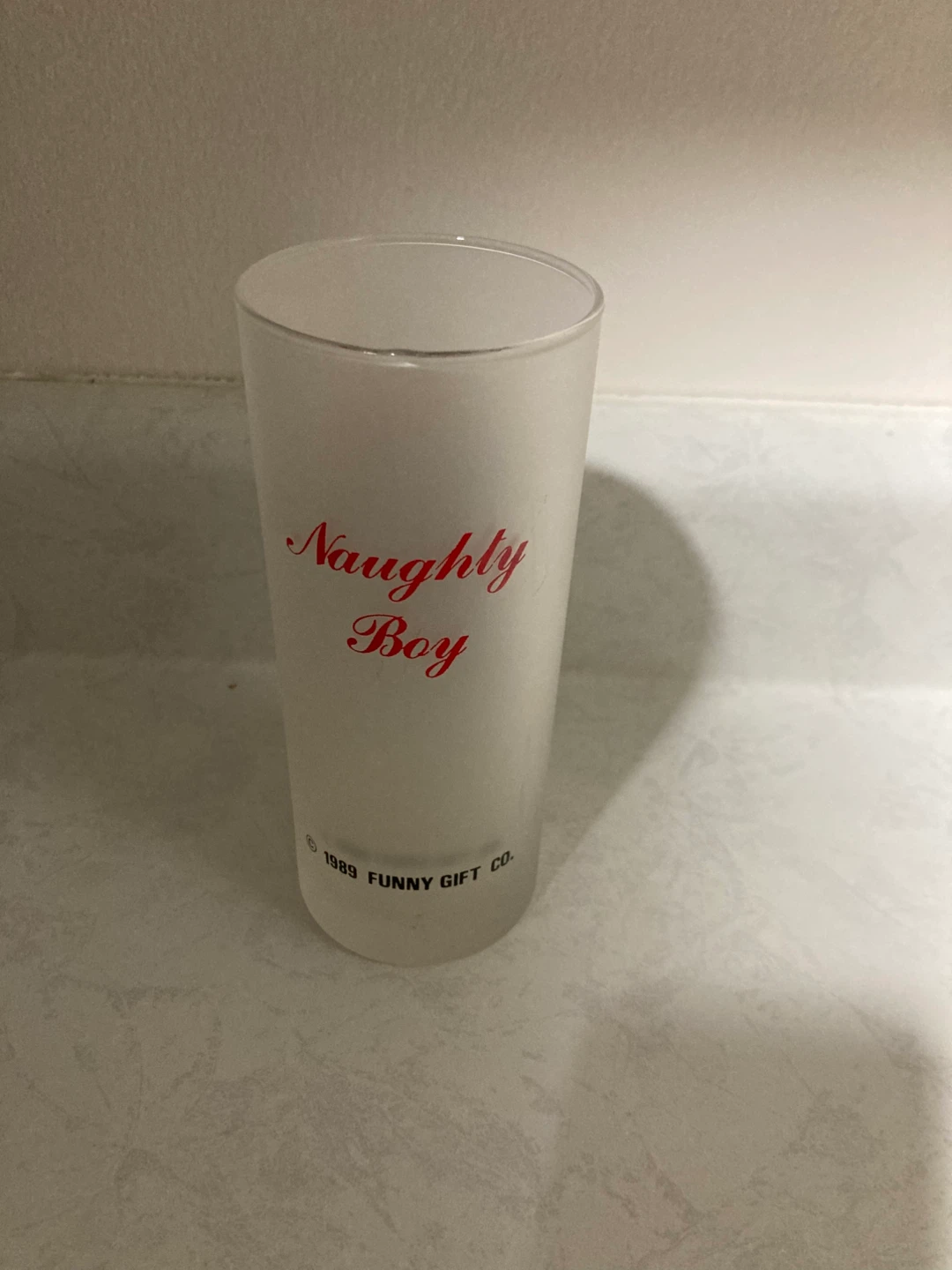 vintage Naughty Boy glass from 1989 Funny Gift Co. It features a playful design and would be a fun addition to any collection or kitchen