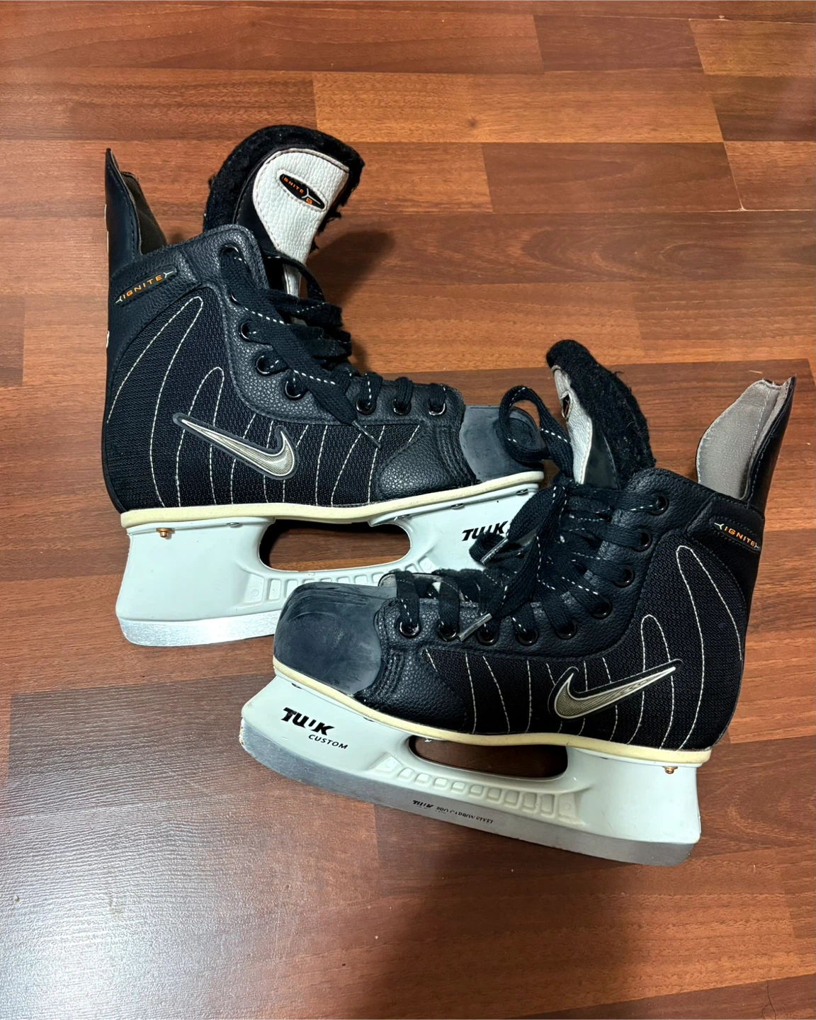 Selling a pair of Nike Ignite ice hockey skates. They're black and feature the iconic Nike swoosh. The blades are TUUK Custom.