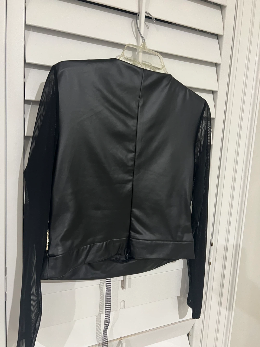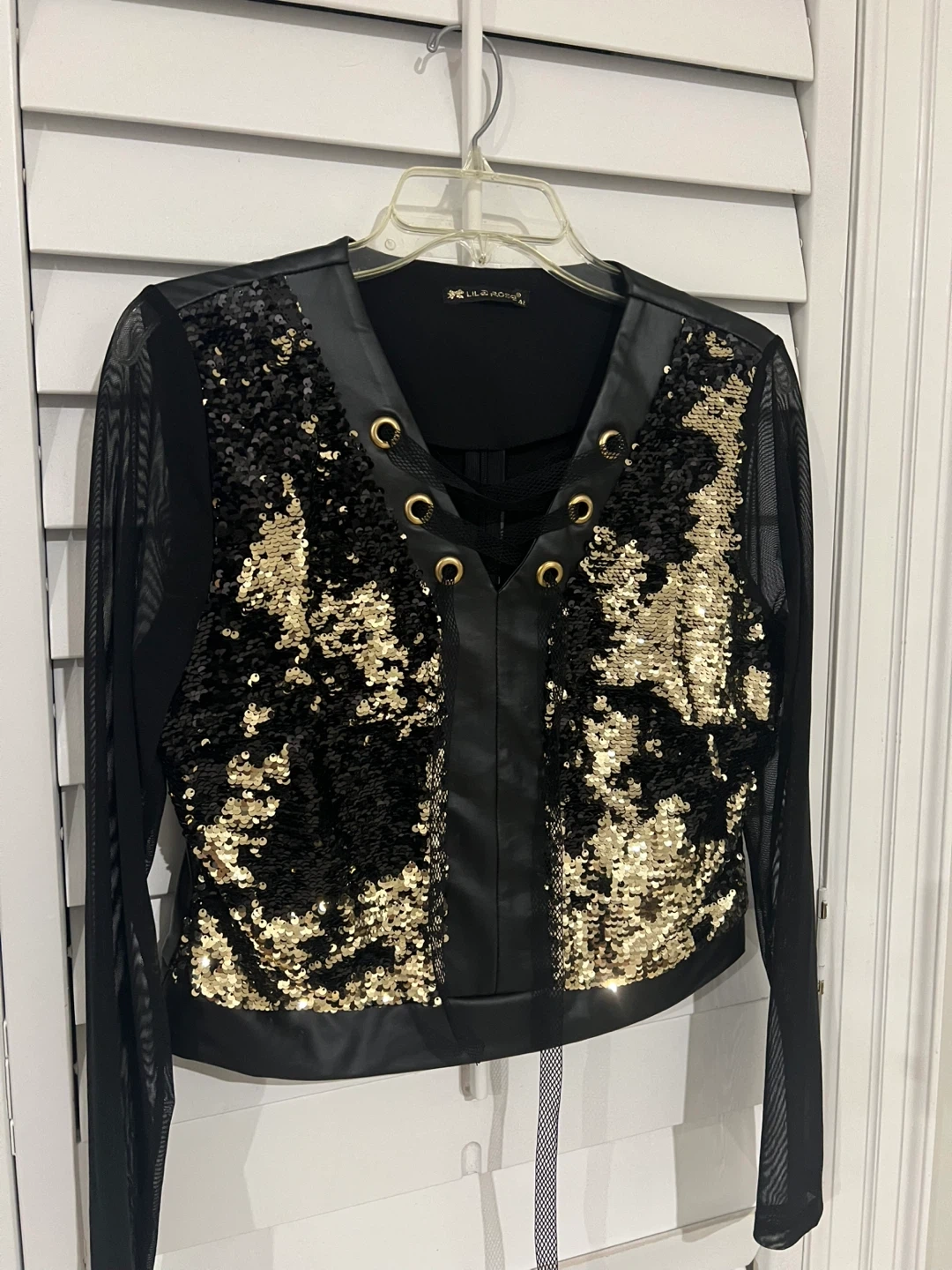 This Lilu & Rose jacket is a real statement piece! It features a unique design with black and gold sequins, faux leather accents, and mesh sleeves. It's perfect for dressing up an outfit or adding some sparkle to your day