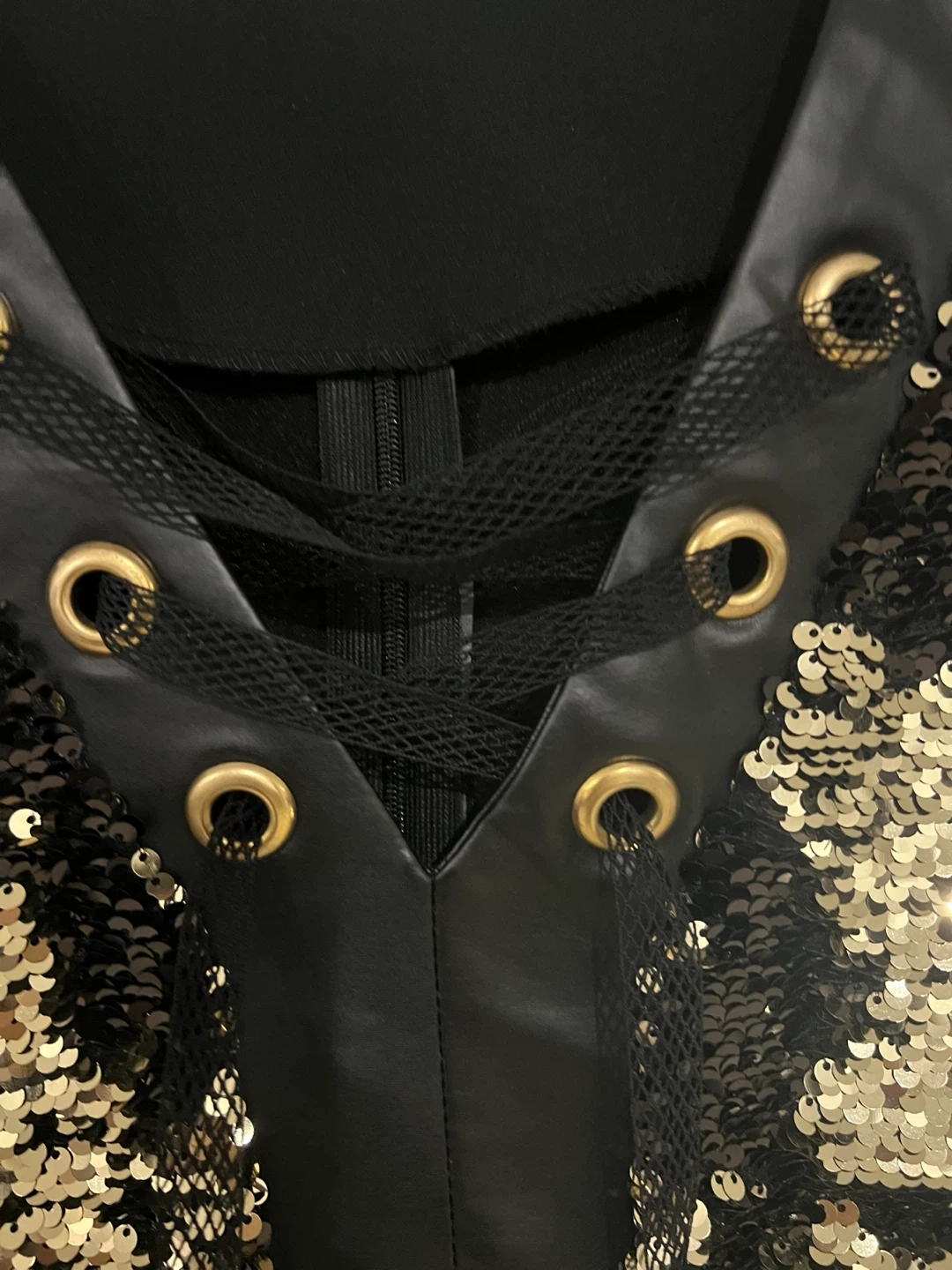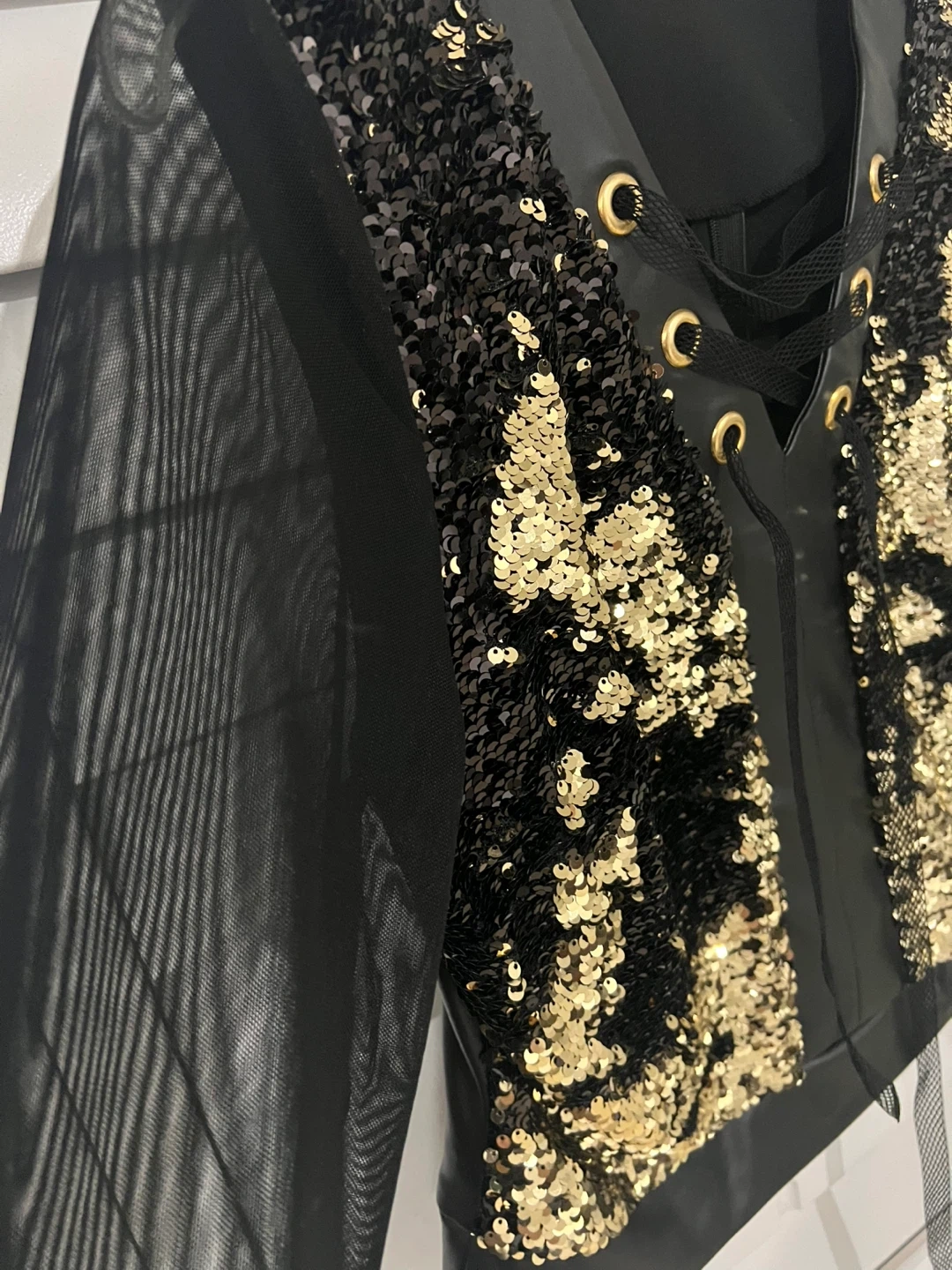 This Lilu & Rose jacket is a real statement piece! It features a unique design with black and gold sequins, faux leather accents, and mesh sleeves. It's perfect for dressing up an outfit or adding some sparkle to your day