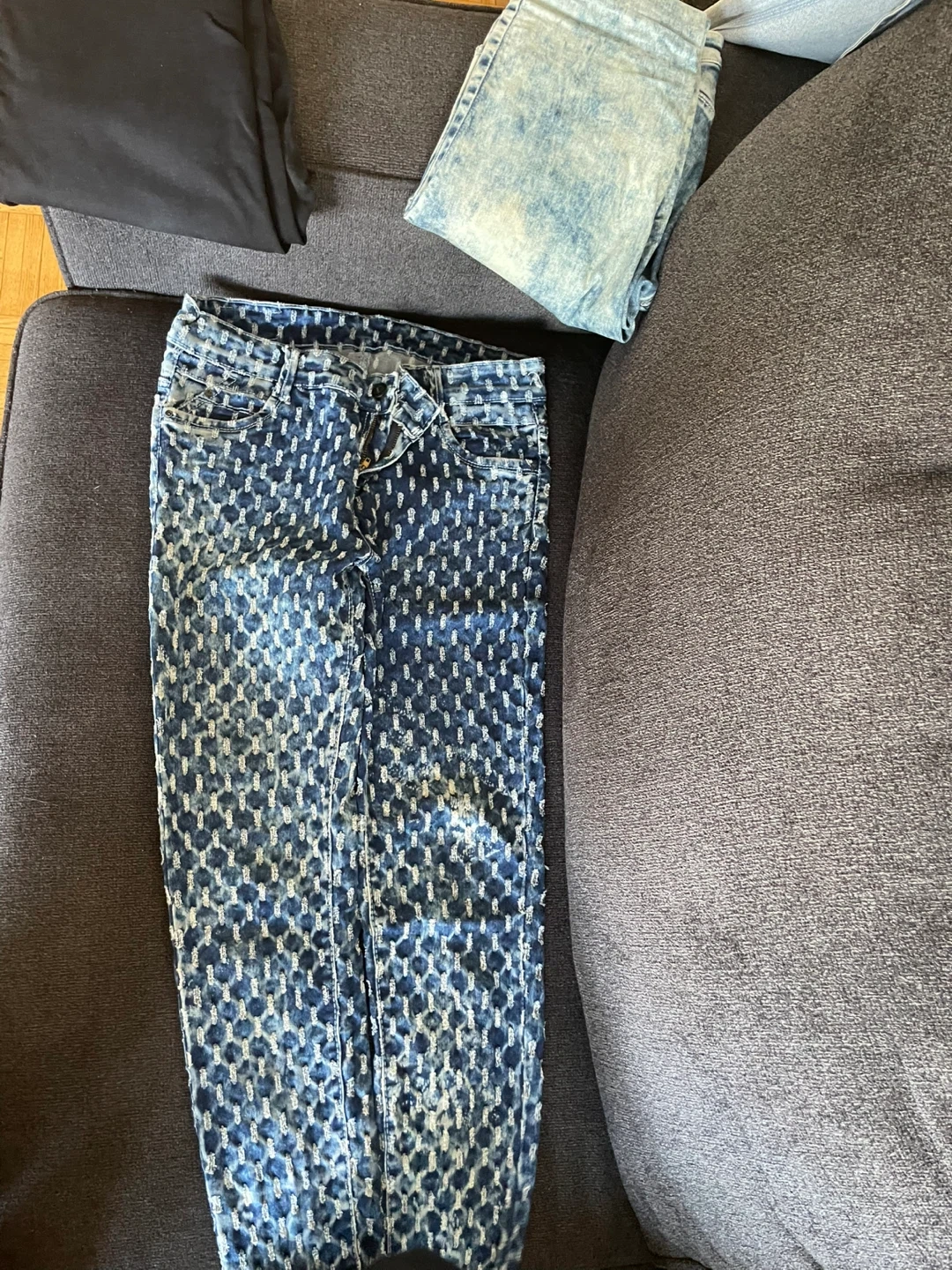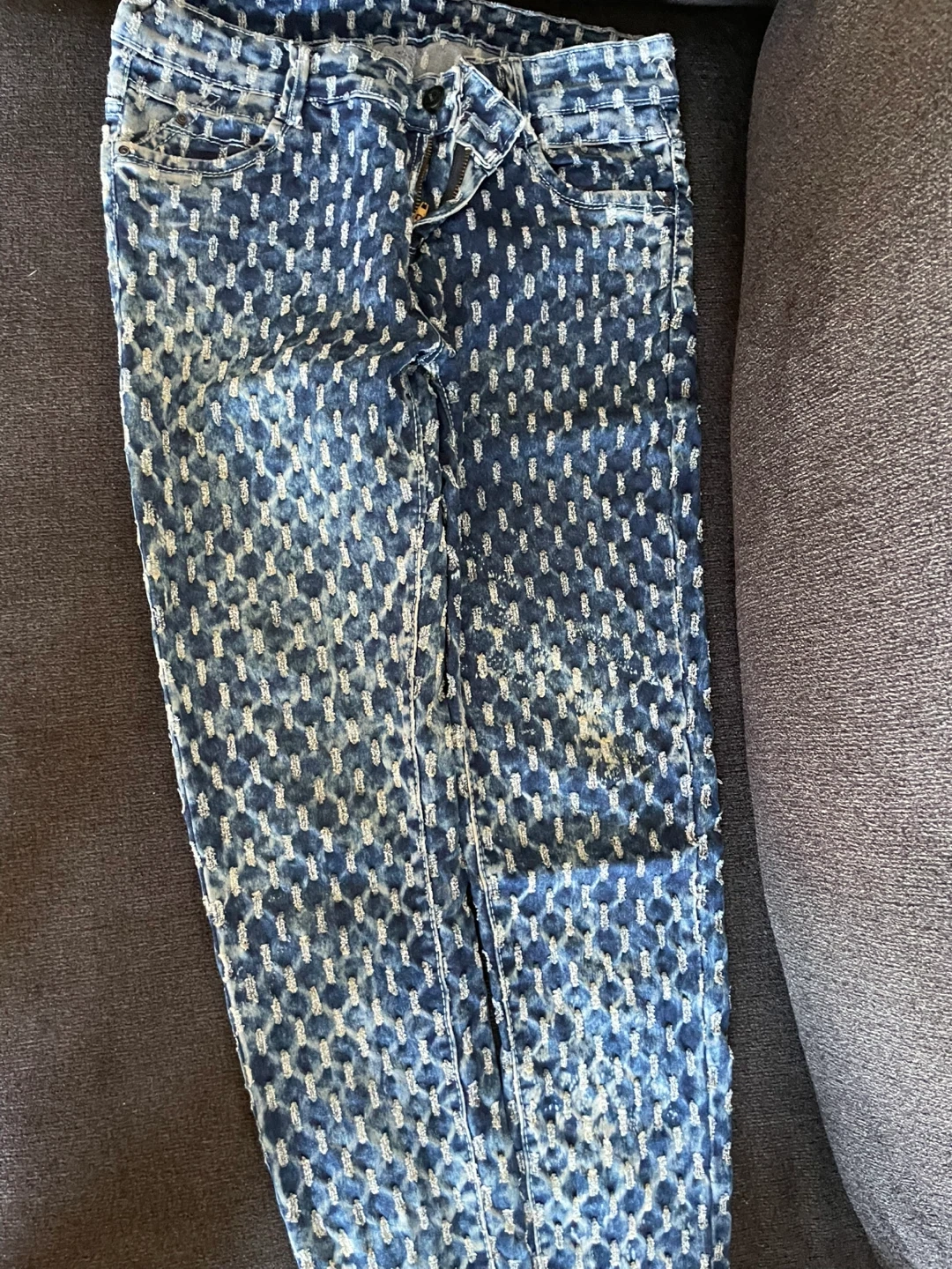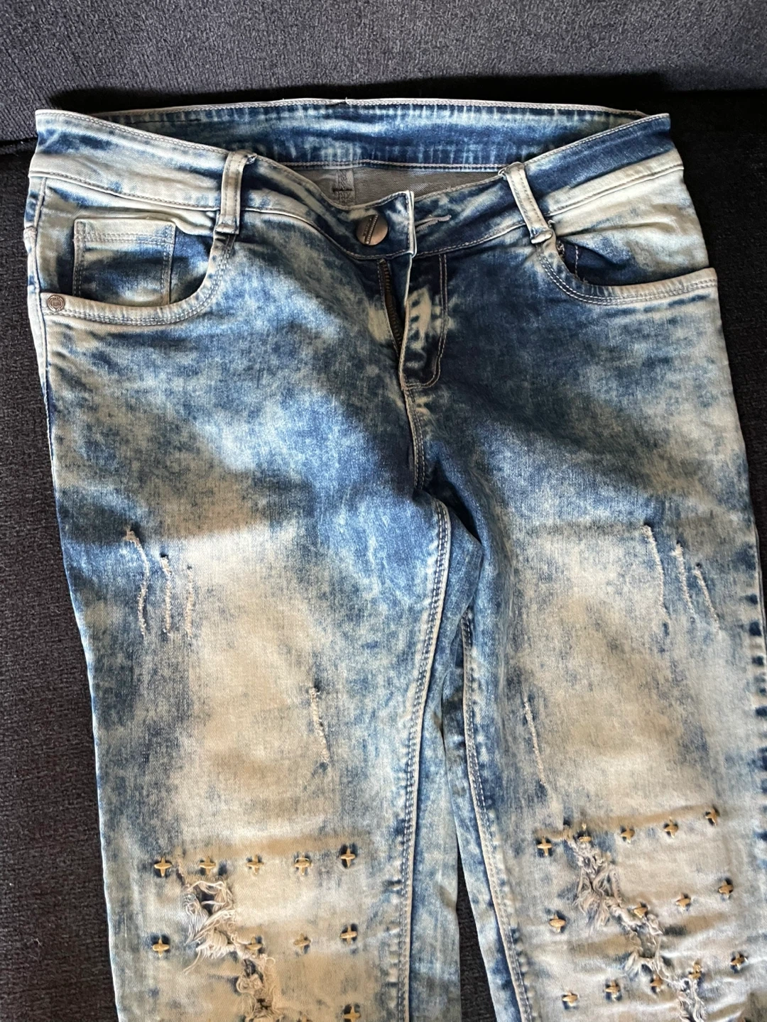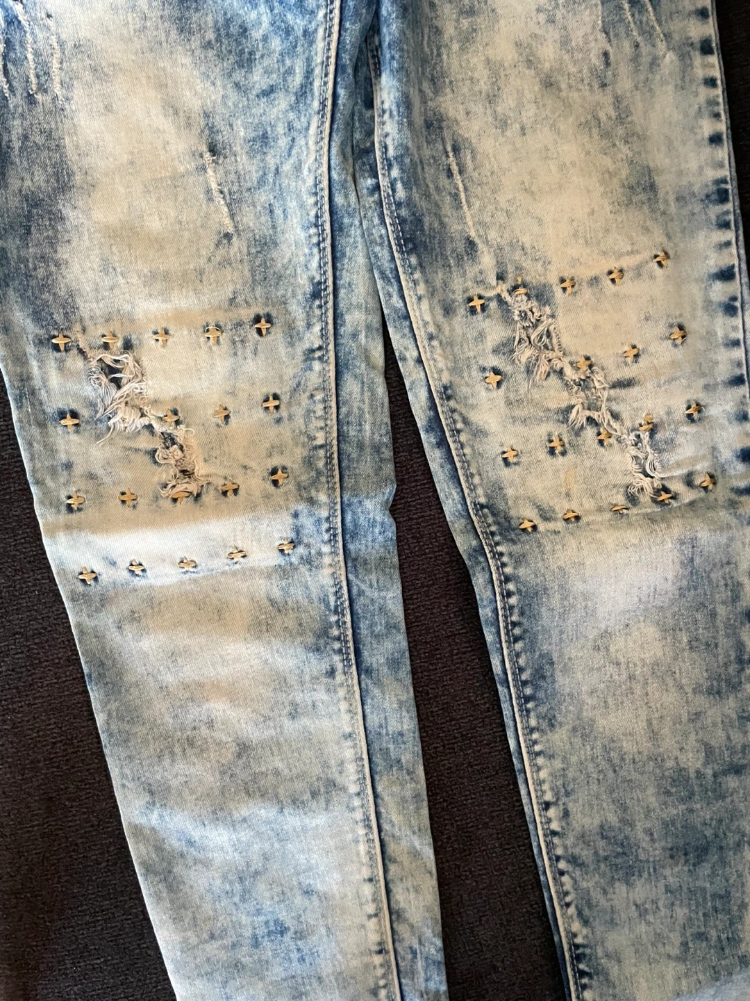 These blue wash jeans feature a distressed look with added studs around the ripped areas. They have a unique all-over pattern that stands out. A cool choice for casual wear!