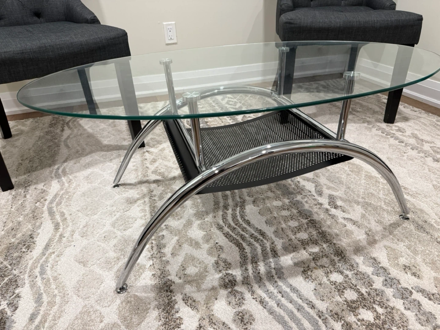 Oval glass top coffee table with a black metal shelf for storage. It features curved chrome legs for a modern look. This table is great for placing drinks or decor in your living room.