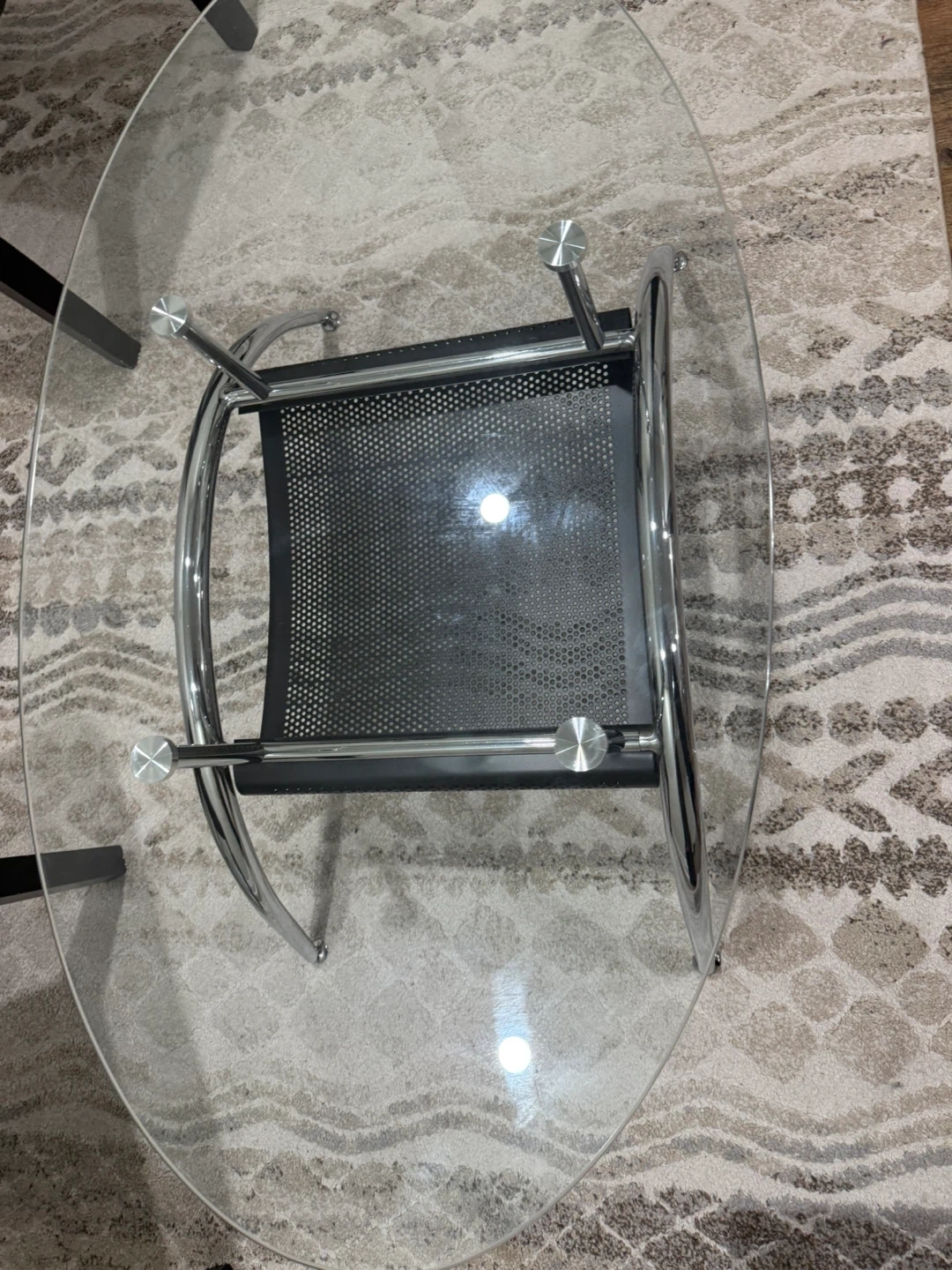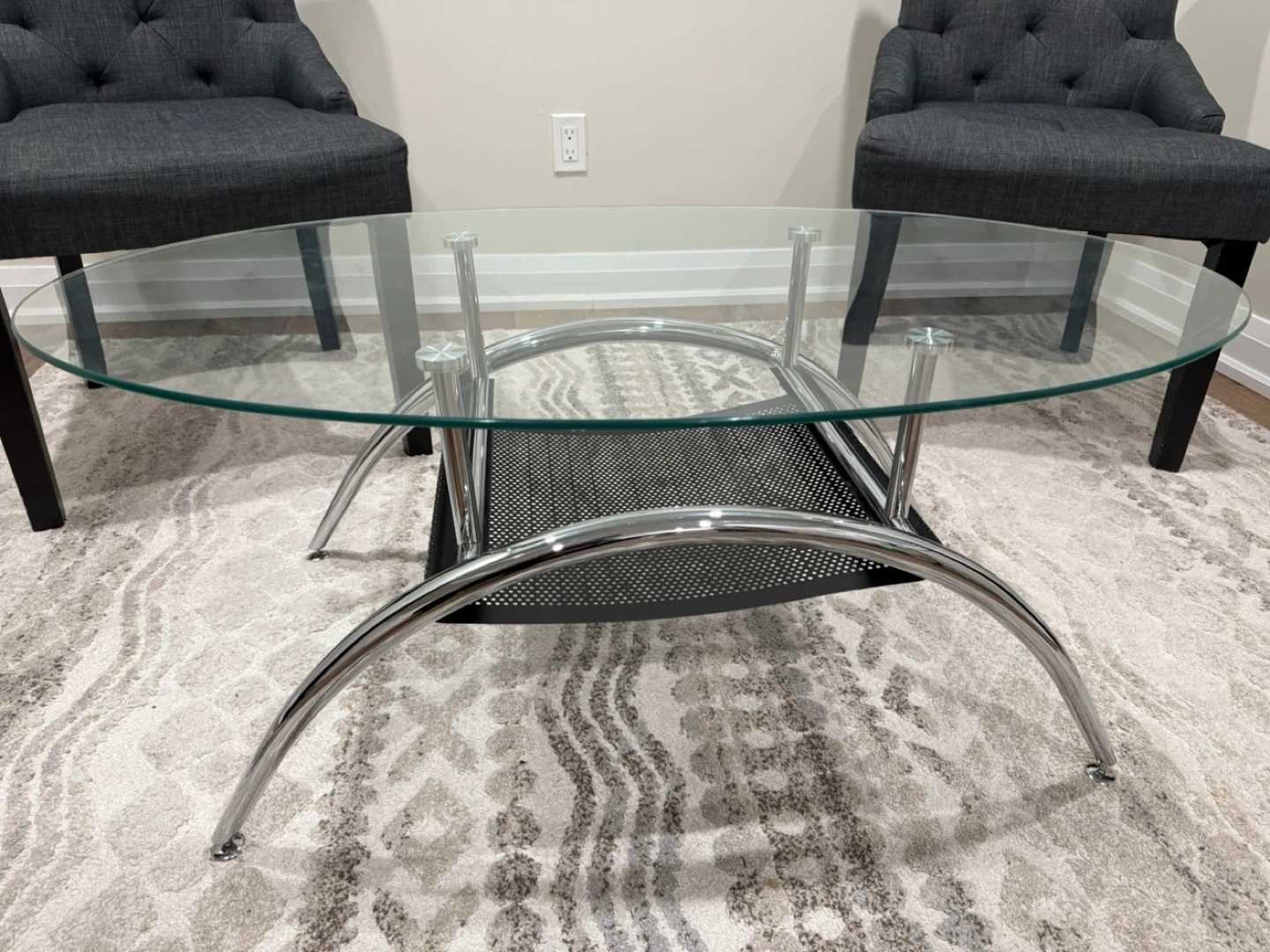 Oval glass top coffee table with a black metal shelf for storage. It features curved chrome legs for a modern look. This table is great for placing drinks or decor in your living room.
