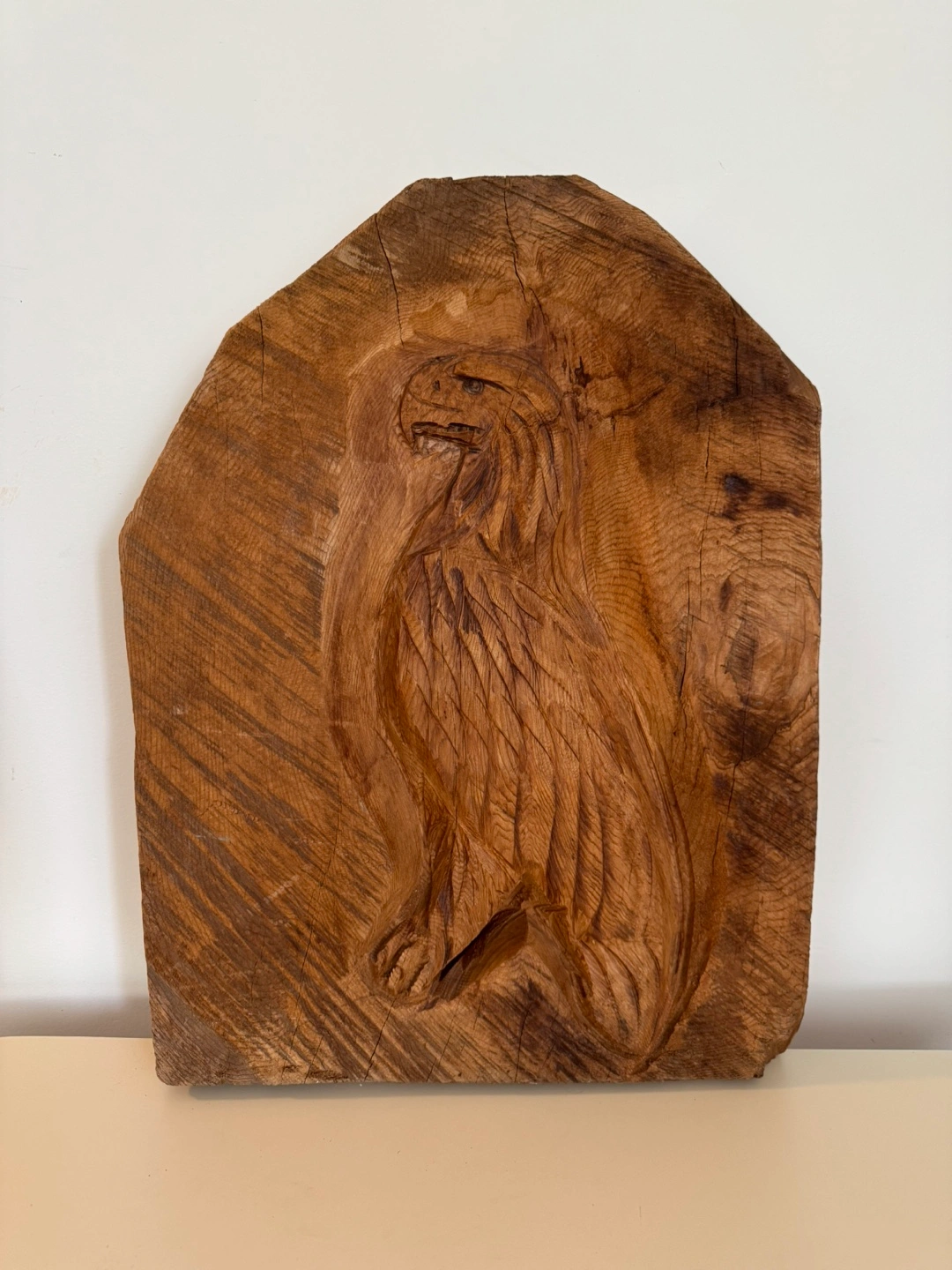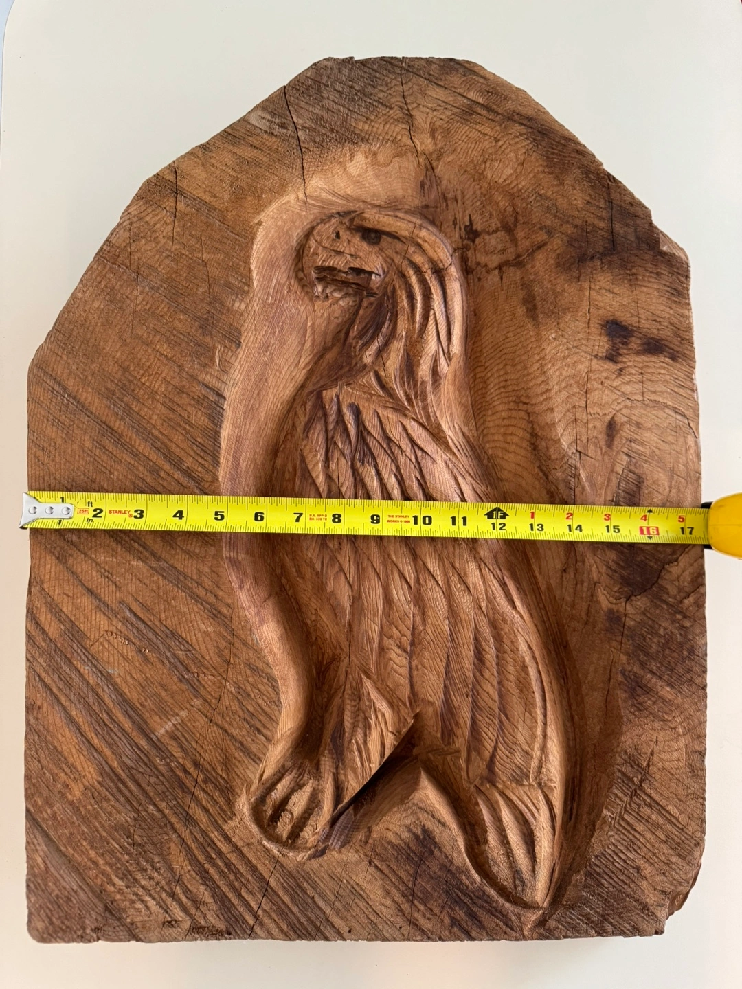 This is a hand-carved wooden plaque featuring an eagle. It's a unique piece of art, perfect for adding a rustic touch to your home decor. The plaque measures approximately 23 inches in length and 17.5 inches in width.