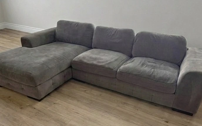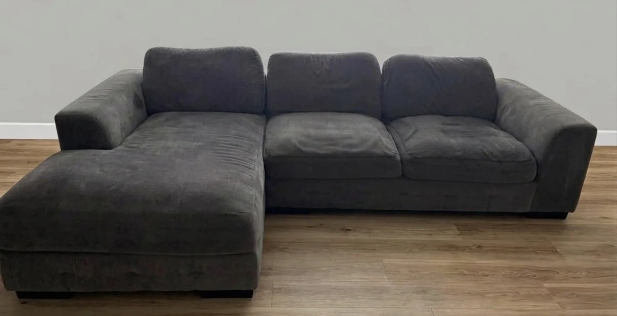 Large L-shaped design featuring a comfortable chaise for lounging. It has been well-maintained and is in excellent condition with deep, supportive cushions. The couch has been cleaned regularly.