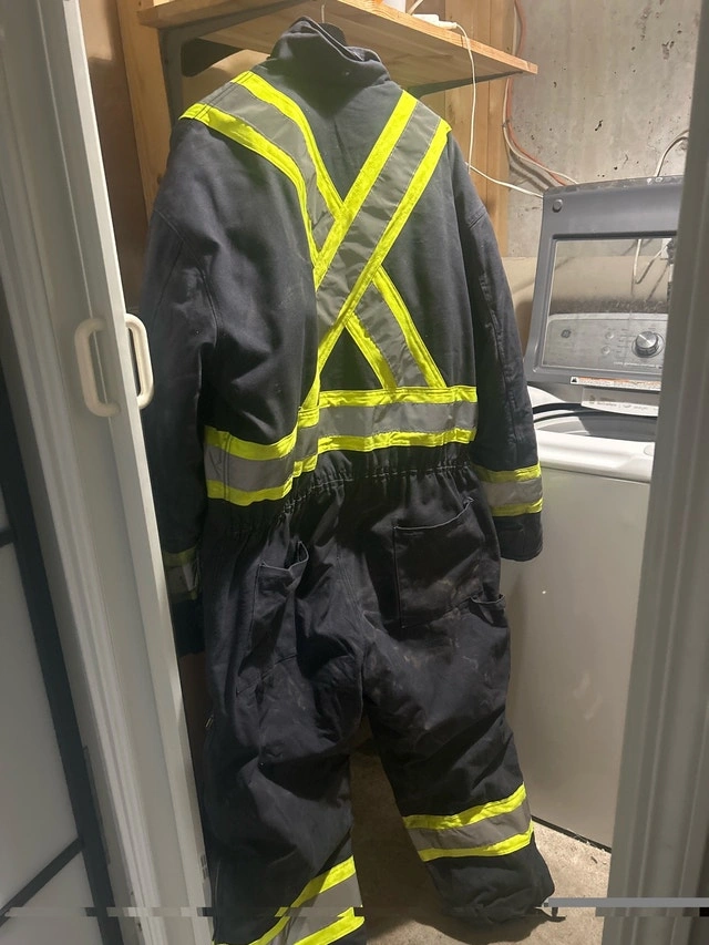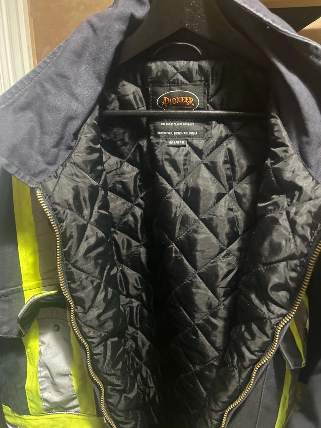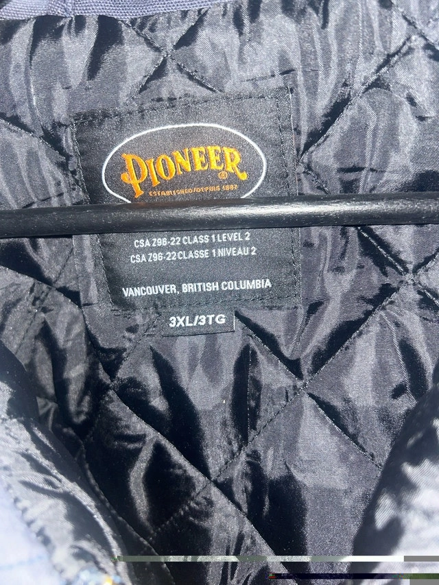 This Pioneer coverall in size 3XL is designed for high visibility and safety on the job, but it's been used and shows some wear and tear, including a hole on the leg. Despite its imperfections, it still has plenty of life left for someone who needs reliable work gear. The quilted interior ensures you'll be kept warm. Features: High-visibility strips, Quilted interior, Size: 3XL. If this ad is still up, the Pioneer coverall is still available!