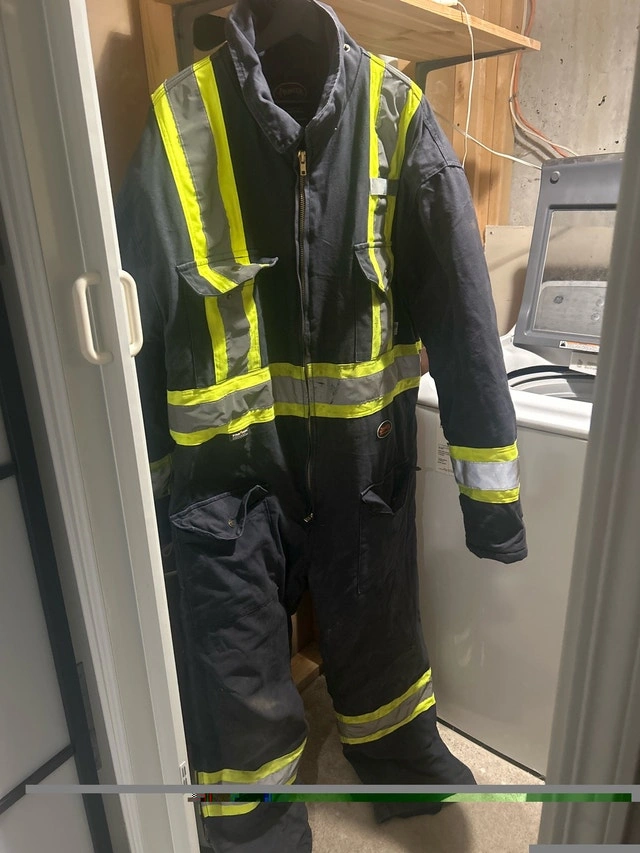 This Pioneer coverall in size 3XL is designed for high visibility and safety on the job, but it's been used and shows some wear and tear, including a hole on the leg. Despite its imperfections, it still has plenty of life left for someone who needs reliable work gear. The quilted interior ensures you'll be kept warm. Features: High-visibility strips, Quilted interior, Size: 3XL. If this ad is still up, the Pioneer coverall is still available!