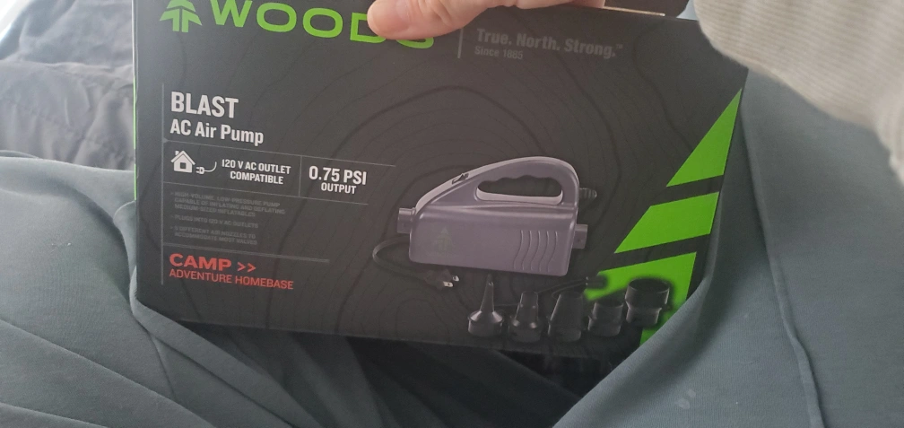 This is a Woods Blast AC Air Pump that comes with multiple attachments. It is 120 V AC outlet compatible.