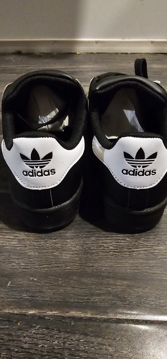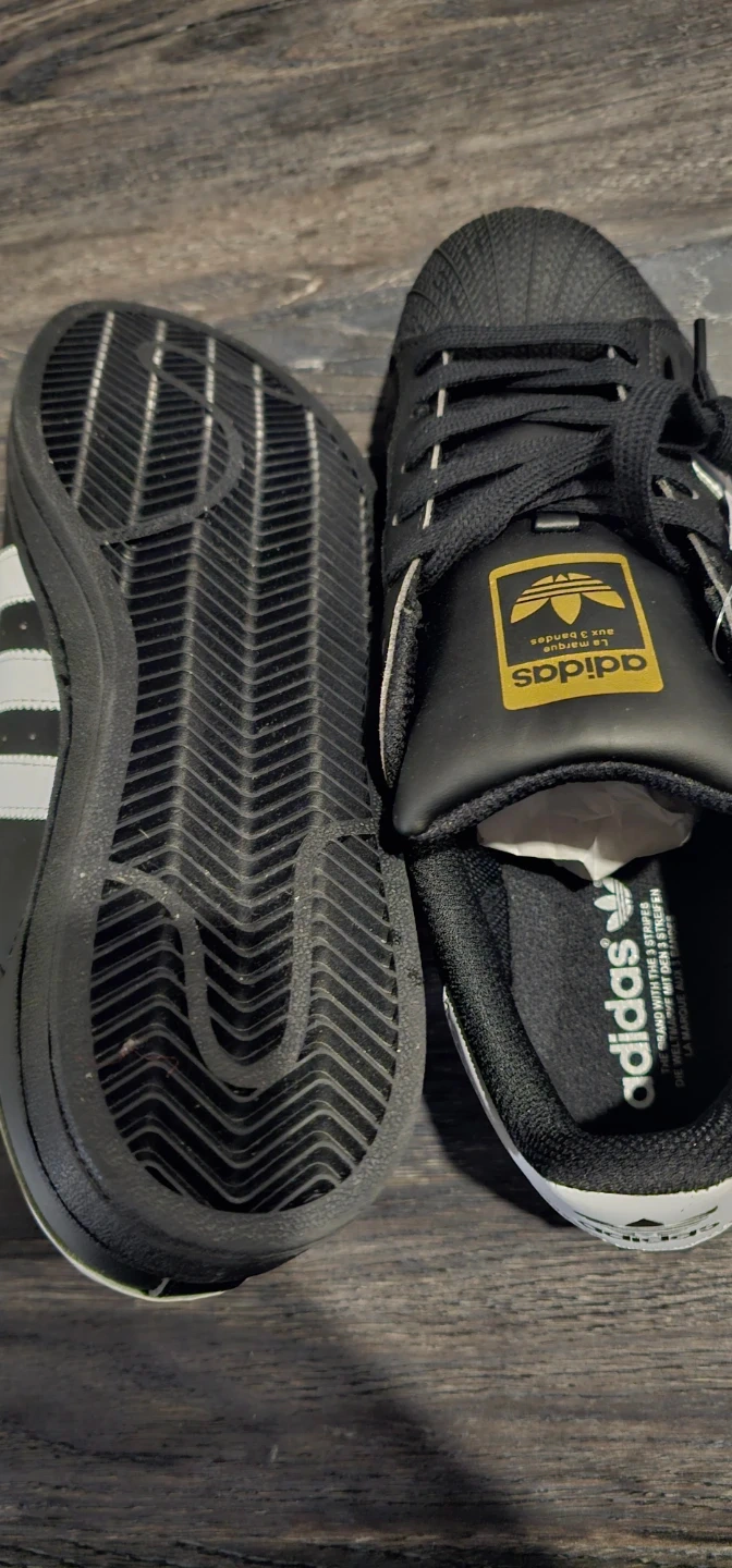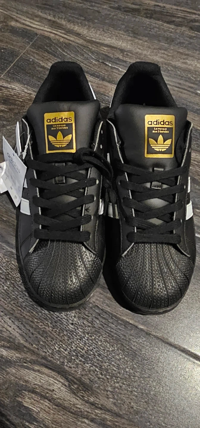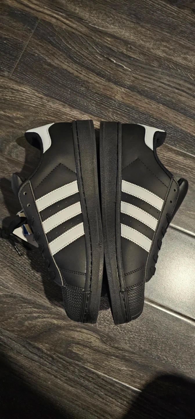 Classic Adidas Superstar sneakers in black with white stripes. These shoes feature a rubber shell toe for durability. Lace closure for a secure fit. Great for everyday wear!