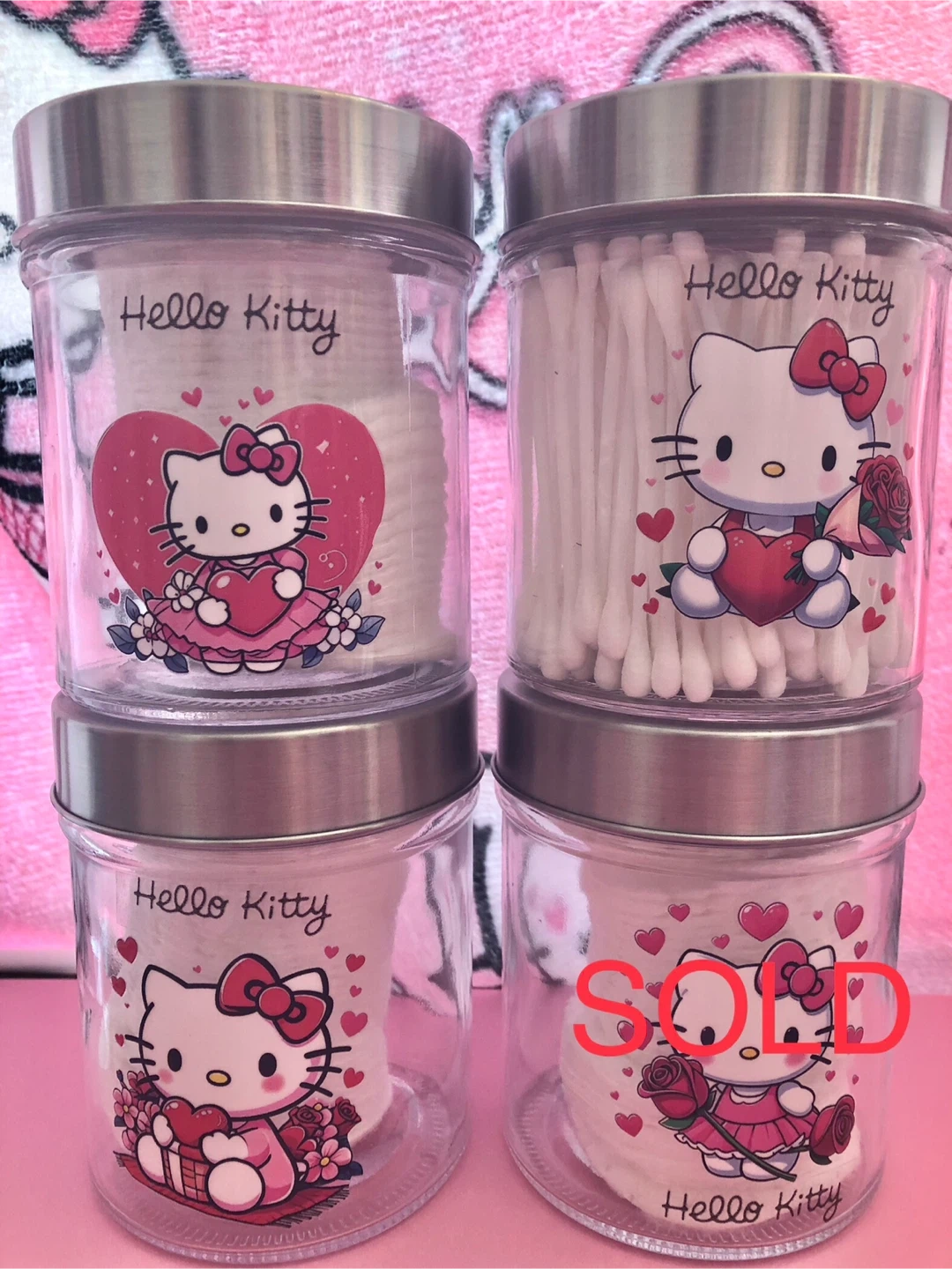 Cute Hello Kitty themed glass storage jars with silver lids. Perfect for organizing cotton balls, swabs, or other small bathroom essentials. Features charming Hello Kitty designs and hearts. Clear glass allows for easy visibility of contents.
