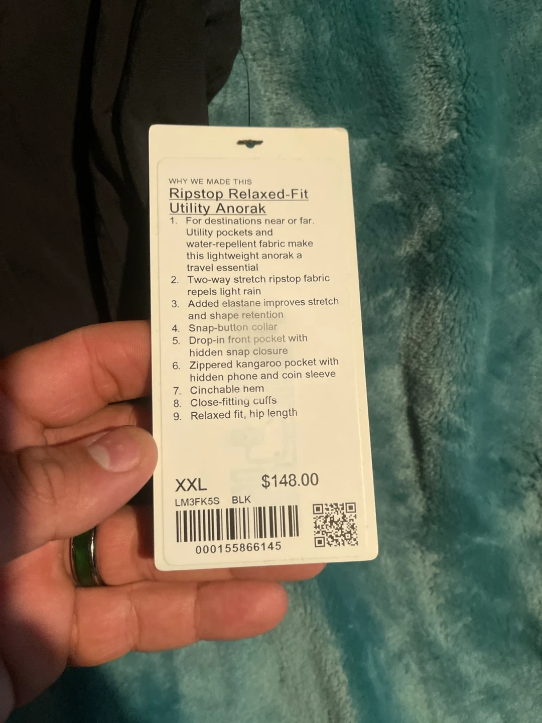 This Lululemon anorak is made from two-way stretch ripstop fabric that repels light rain. It features a snap-button collar, drop-in front pocket with hidden snap closure, and a zippered kangaroo pocket with hidden phone and coin sleeve. It's designed for relaxed fit and hip length.
