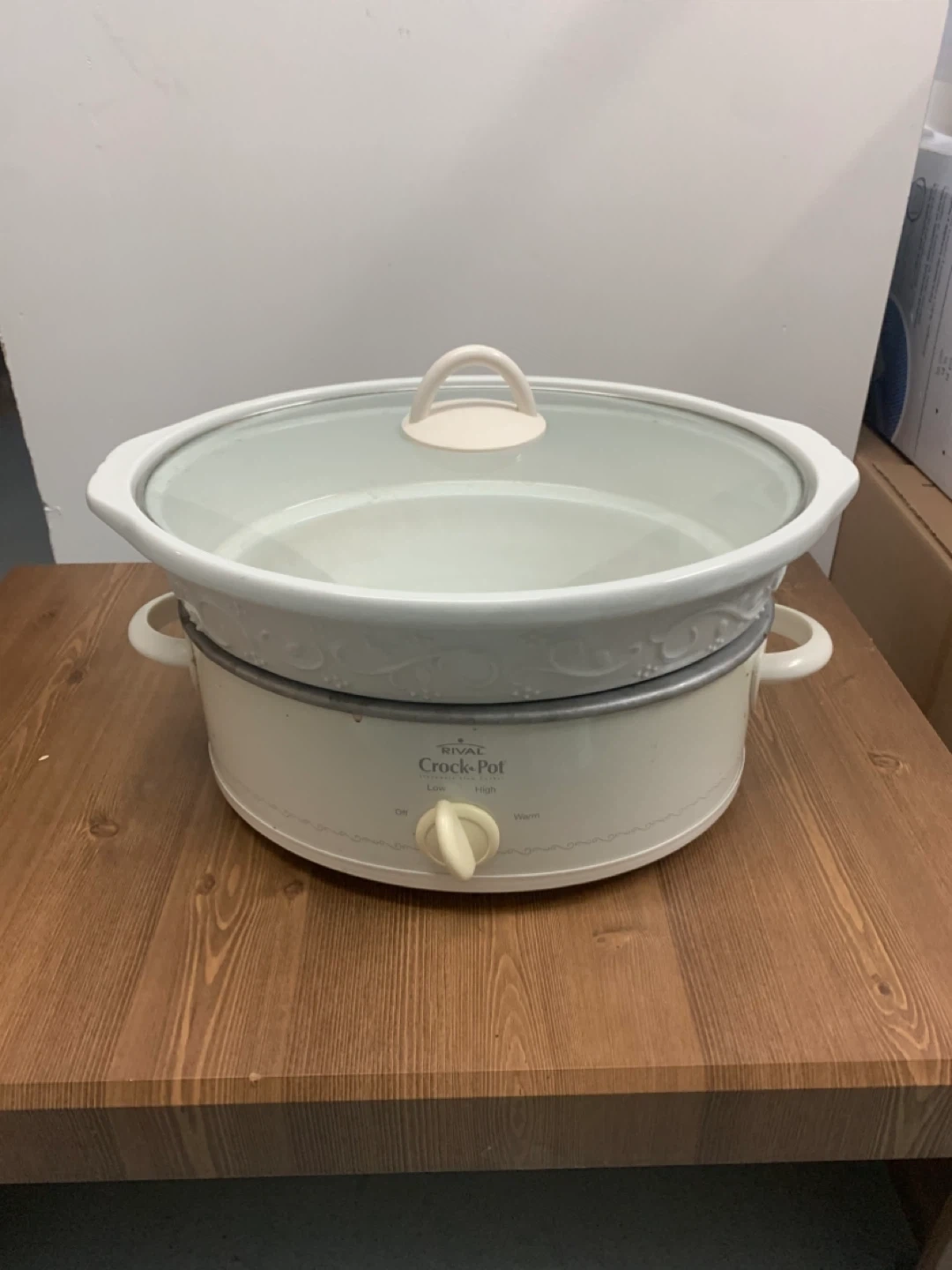 This Rival Crock-Pot slow cooker is a cream colour. It features Off, Low, High, and Warm settings. It's great for preparing meals with minimal effort.