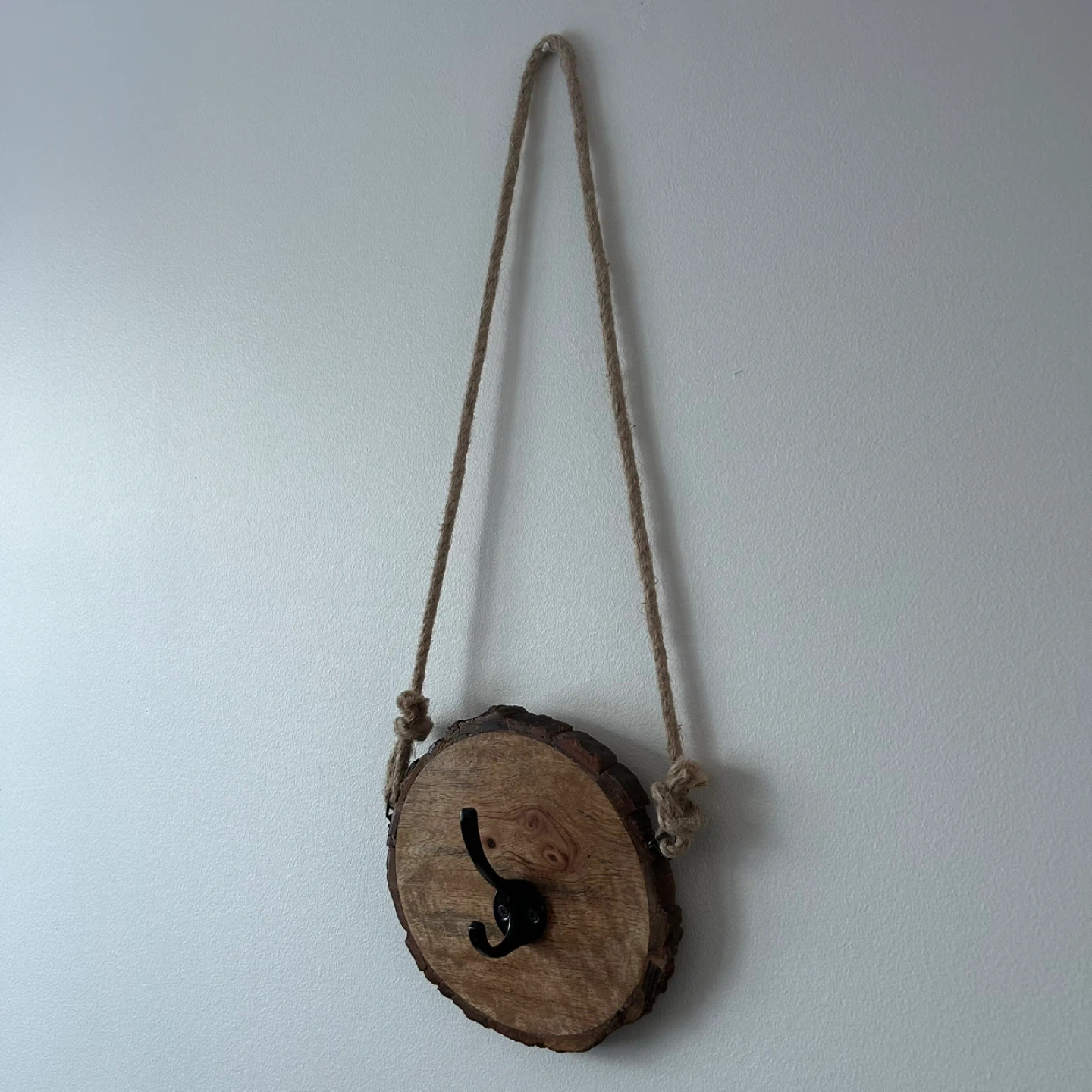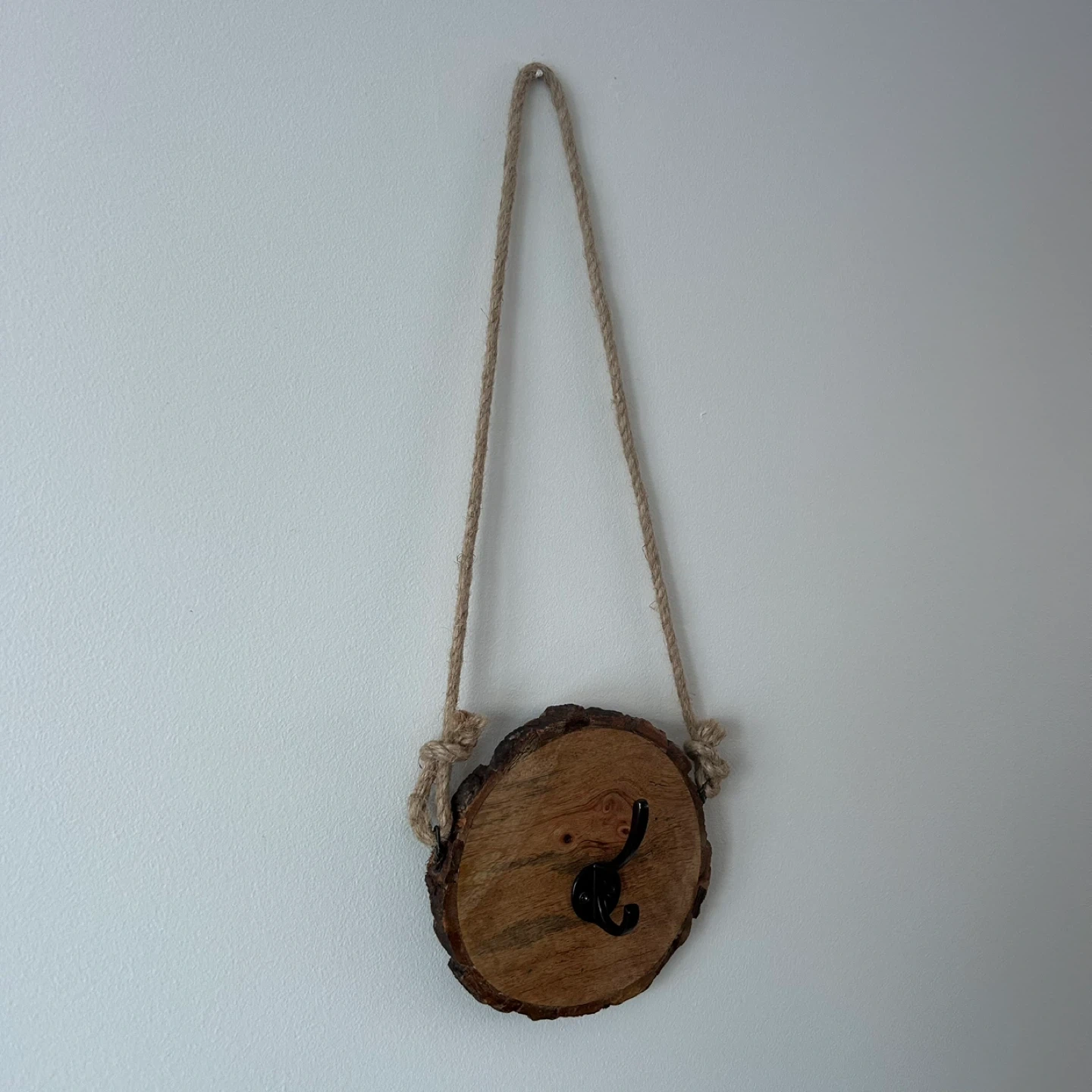 Wall Hanging Live Edge Wood With Black Metal Hook And With A Long Rope Attached To Hang With As Well As A Black Key Hole Hanger On The Back