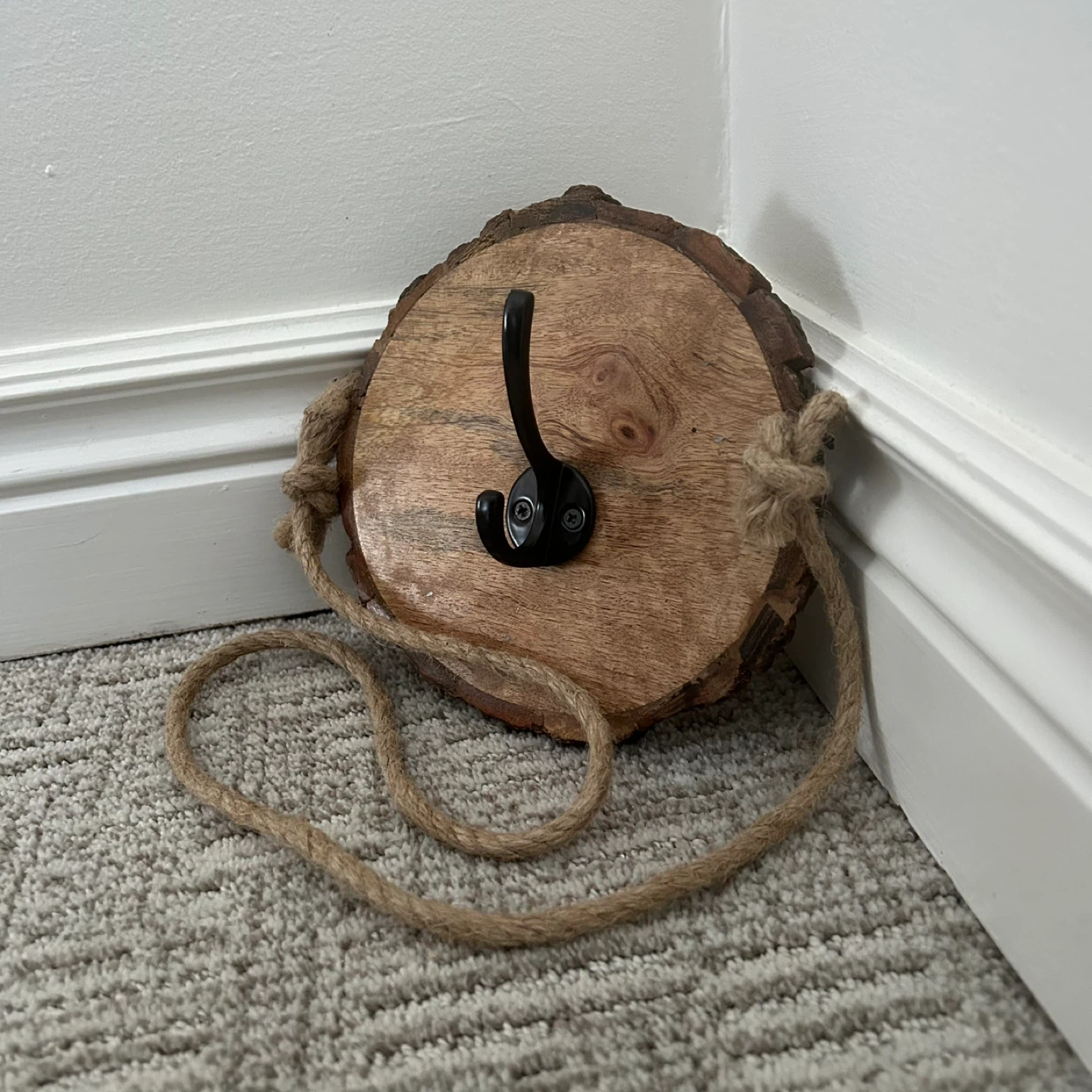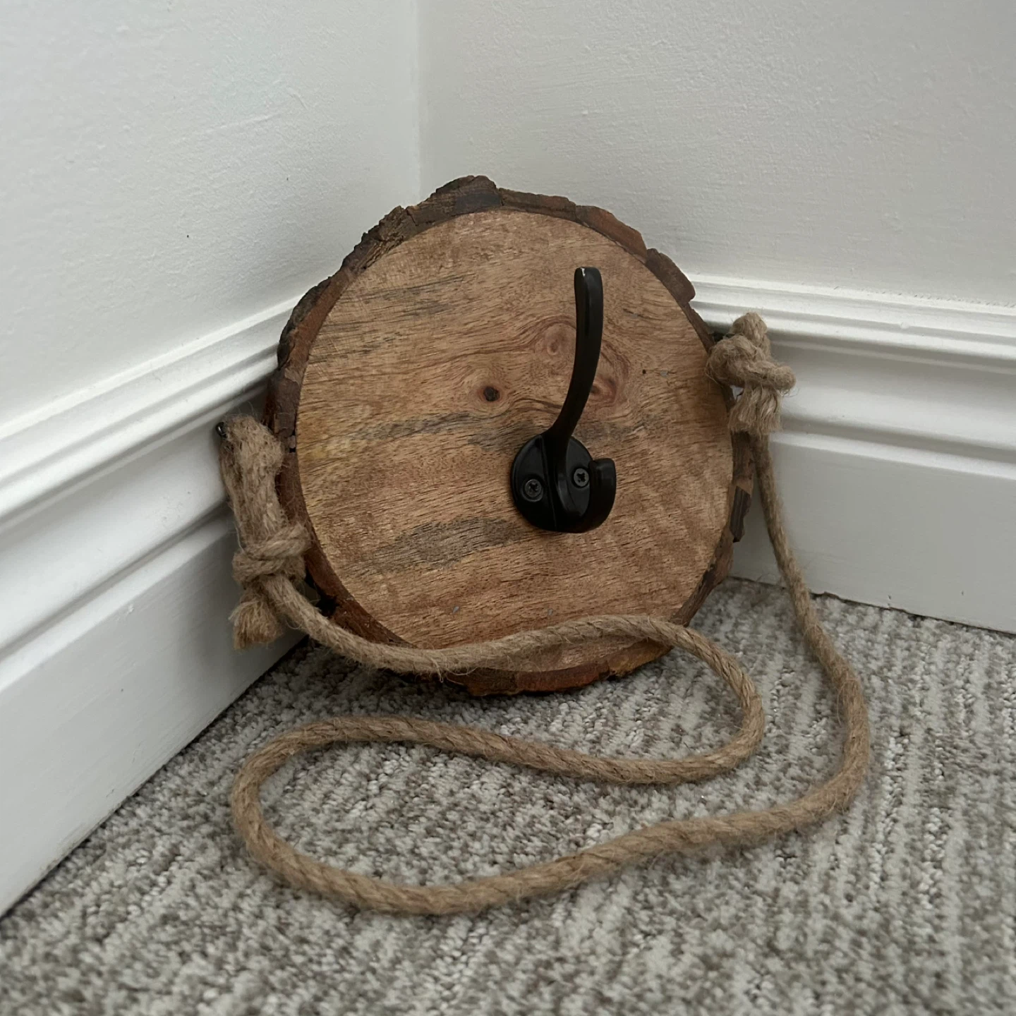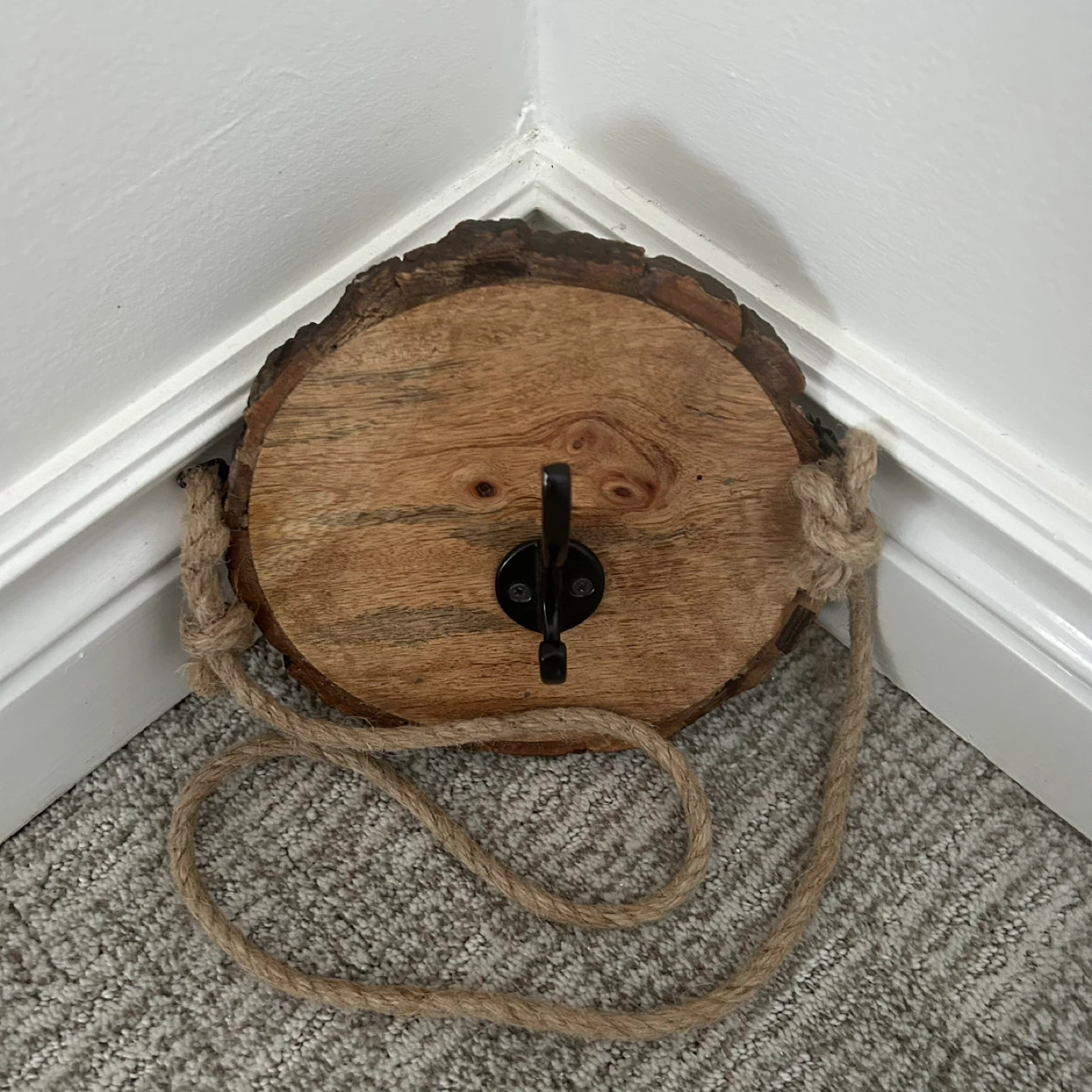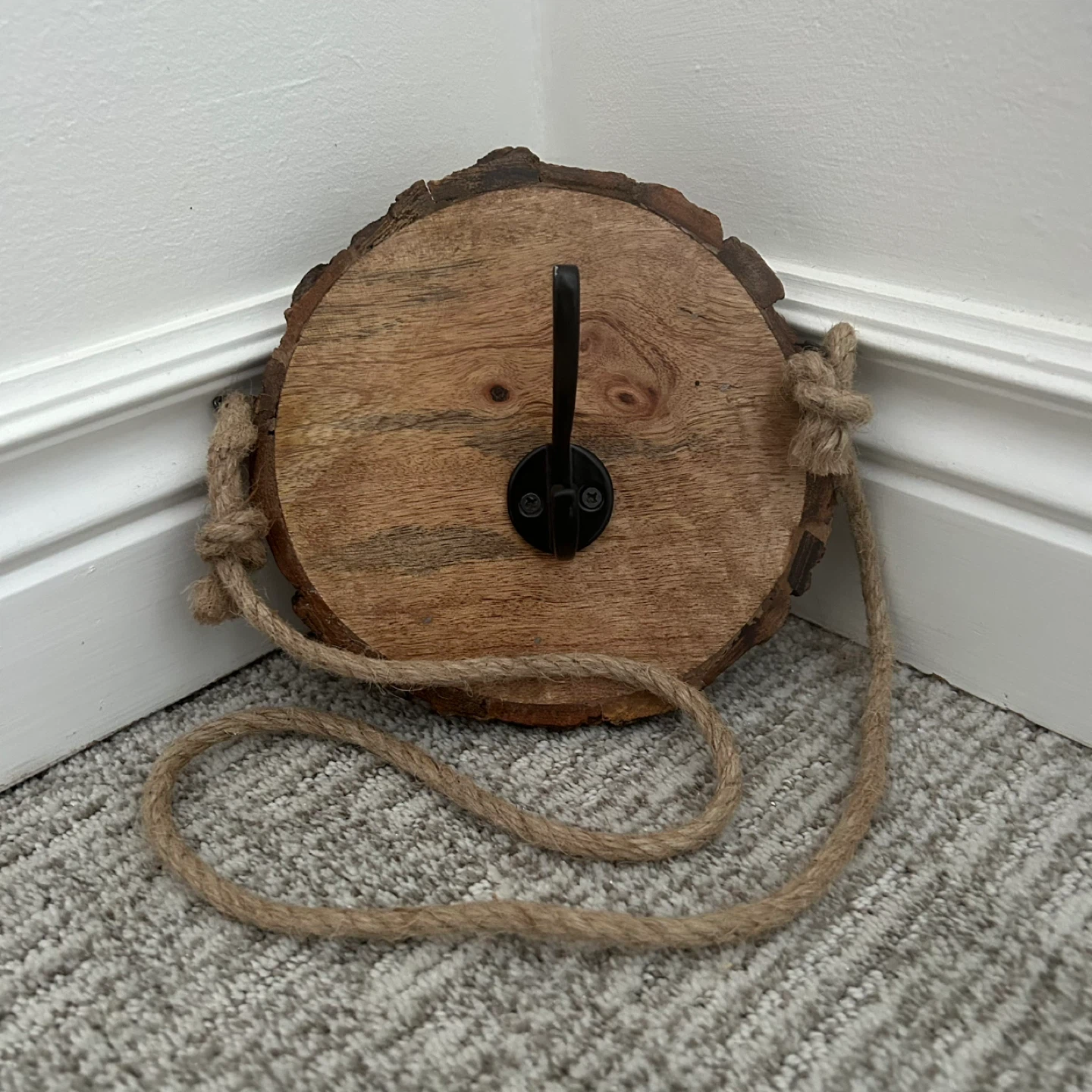 Wall Hanging Live Edge Wood With Black Metal Hook And With A Long Rope Attached To Hang With As Well As A Black Key Hole Hanger On The Back