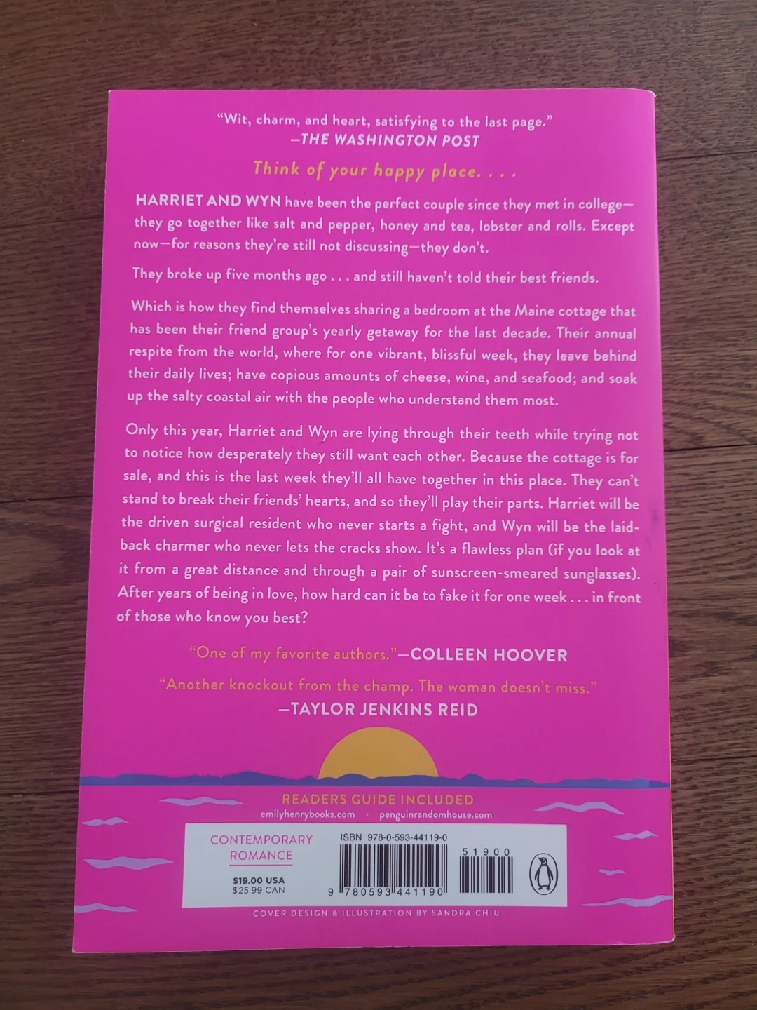 This is the novel "Happy Place" by Emily Henry. It's a contemporary romance about Harriet and Wyn. The book explores themes of friendship and love.