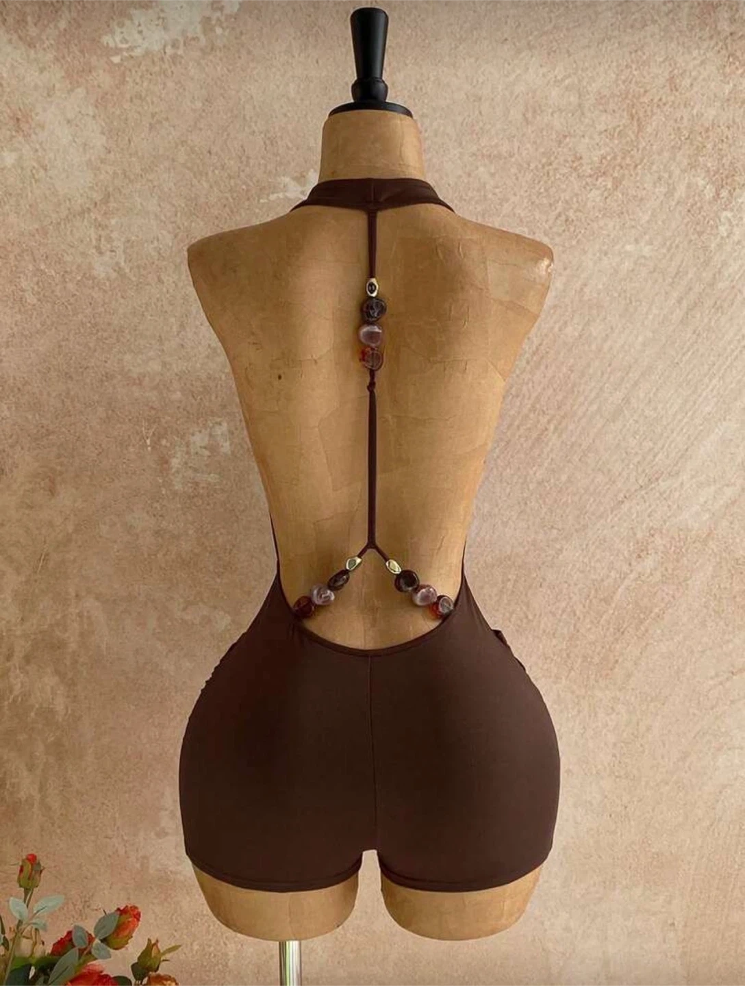 This stylish brown romper features a plunging halter neckline with a daring cutout. It's designed with ruching and a decorative buckle detail at the waist. The back boasts an intricate beaded strap design.