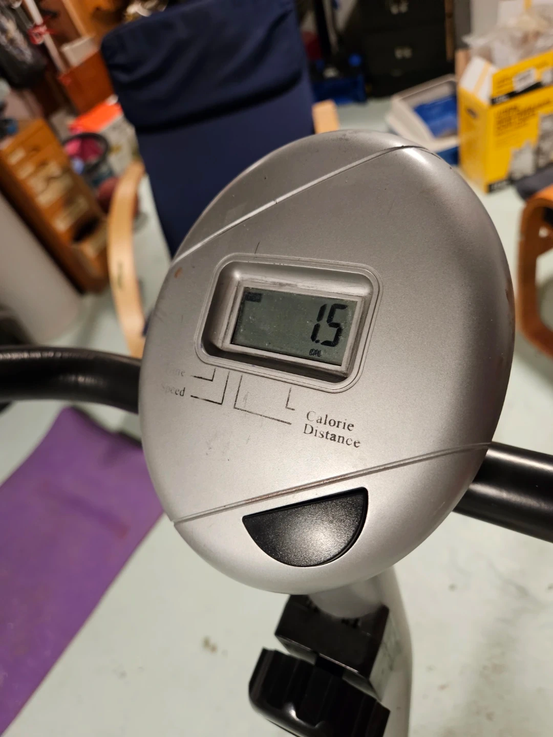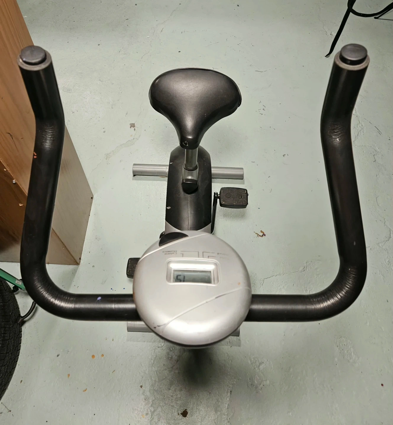 Black stationary exercise bike by FitnessClub. It has an adjustable seat and a digital display showing speed, distance, and calories burned. This bike is great for home workouts!