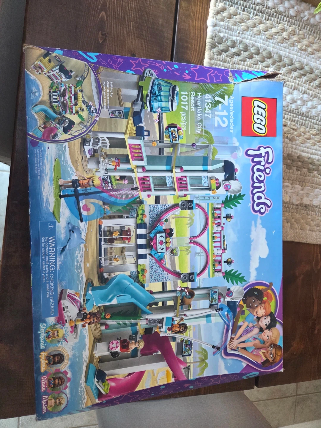This LEGO Friends Heartlake City Resort set features 1017 pieces. It's recommended for ages 7-12. Included are the characters Stephanie, Andrea, Olivia, and Mason. The resort model includes multiple levels and beachside elements.