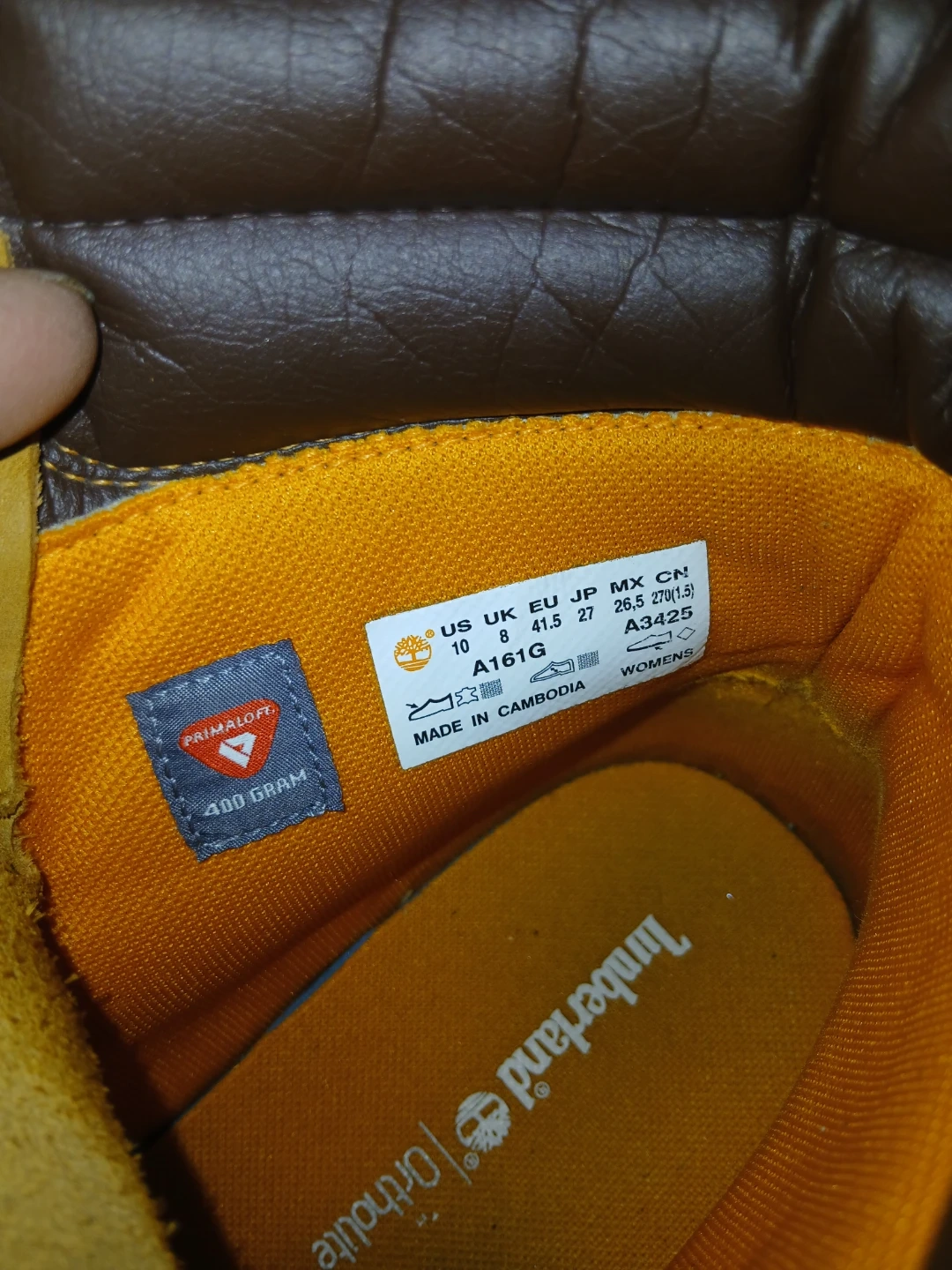 Selling a pair of Timberland women's boots, model A161G in US size 10. These boots are made in Cambodia and feature Primaloft 400 gram insulation and Ortholite insoles. They are in good condition and ready for a new owner!