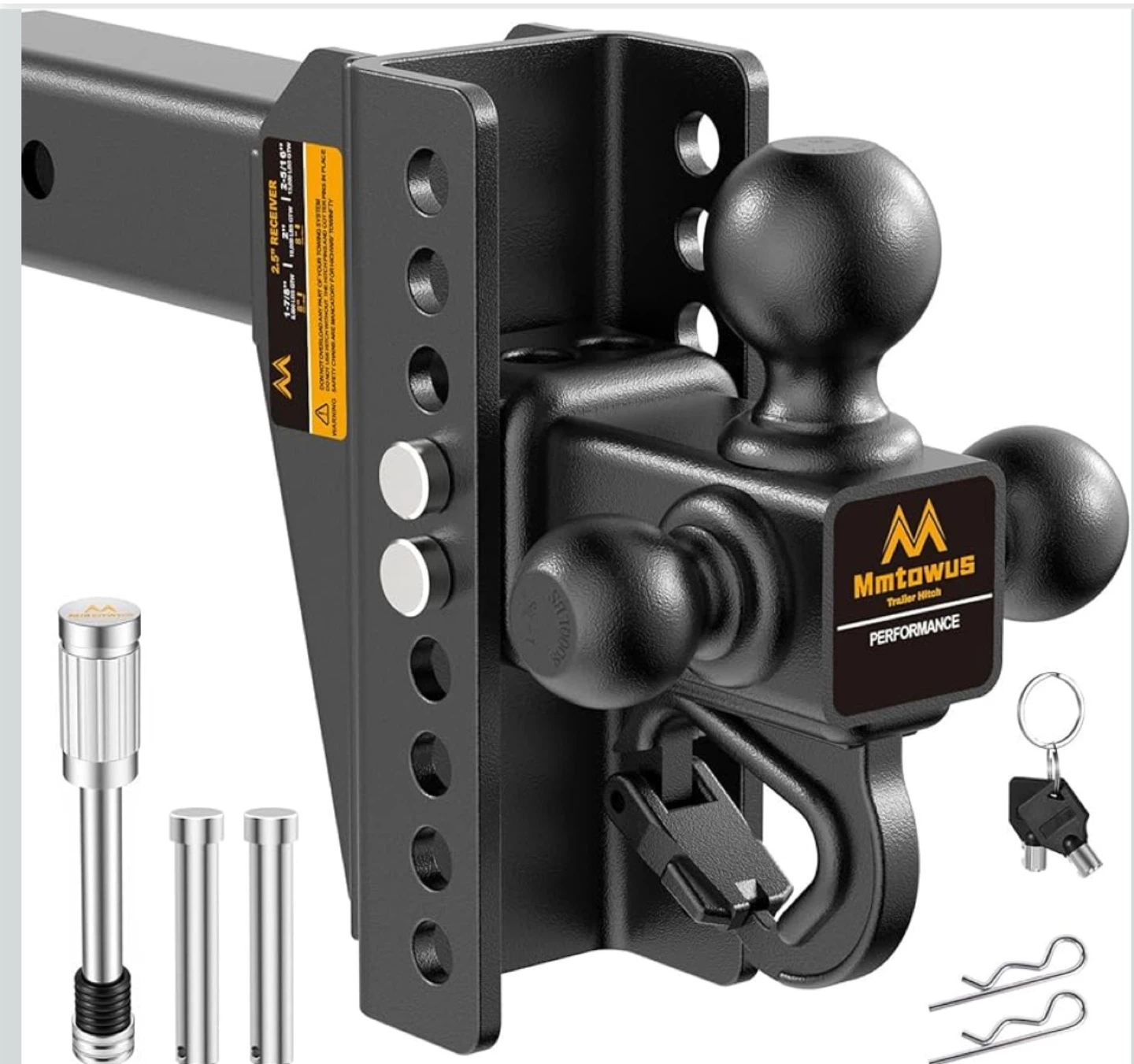 This Mmtowus trailer hitch is designed for performance and adjustability. It has a 2.5" receiver and comes with locking pins and keys. It's suitable for various towing needs.