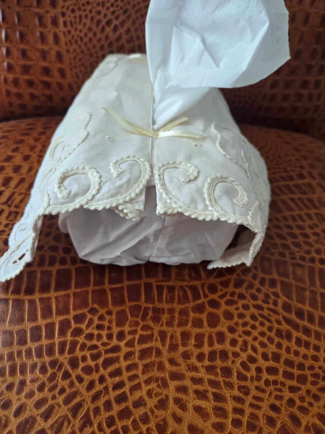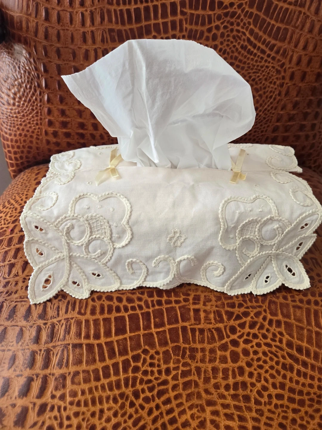 New Vintage Elegant white embroidered tissue box cover with delicate floral patterns. Fits a standard rectangular tissue box. Adds a touch of vintage charm to any room!
