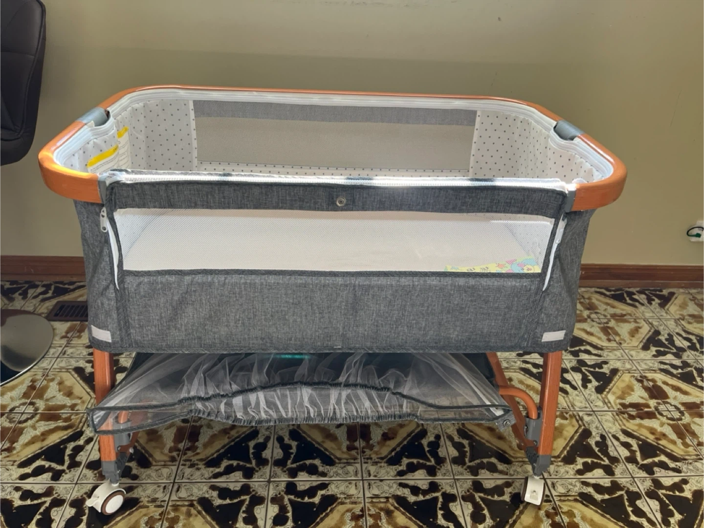 Selling a gently used baby bassinet! It's in great condition and ready for a new little one. The bassinet features a sturdy frame, breathable mesh sides, and a comfortable sleeping surface. It also has wheels for easy movement around the house.