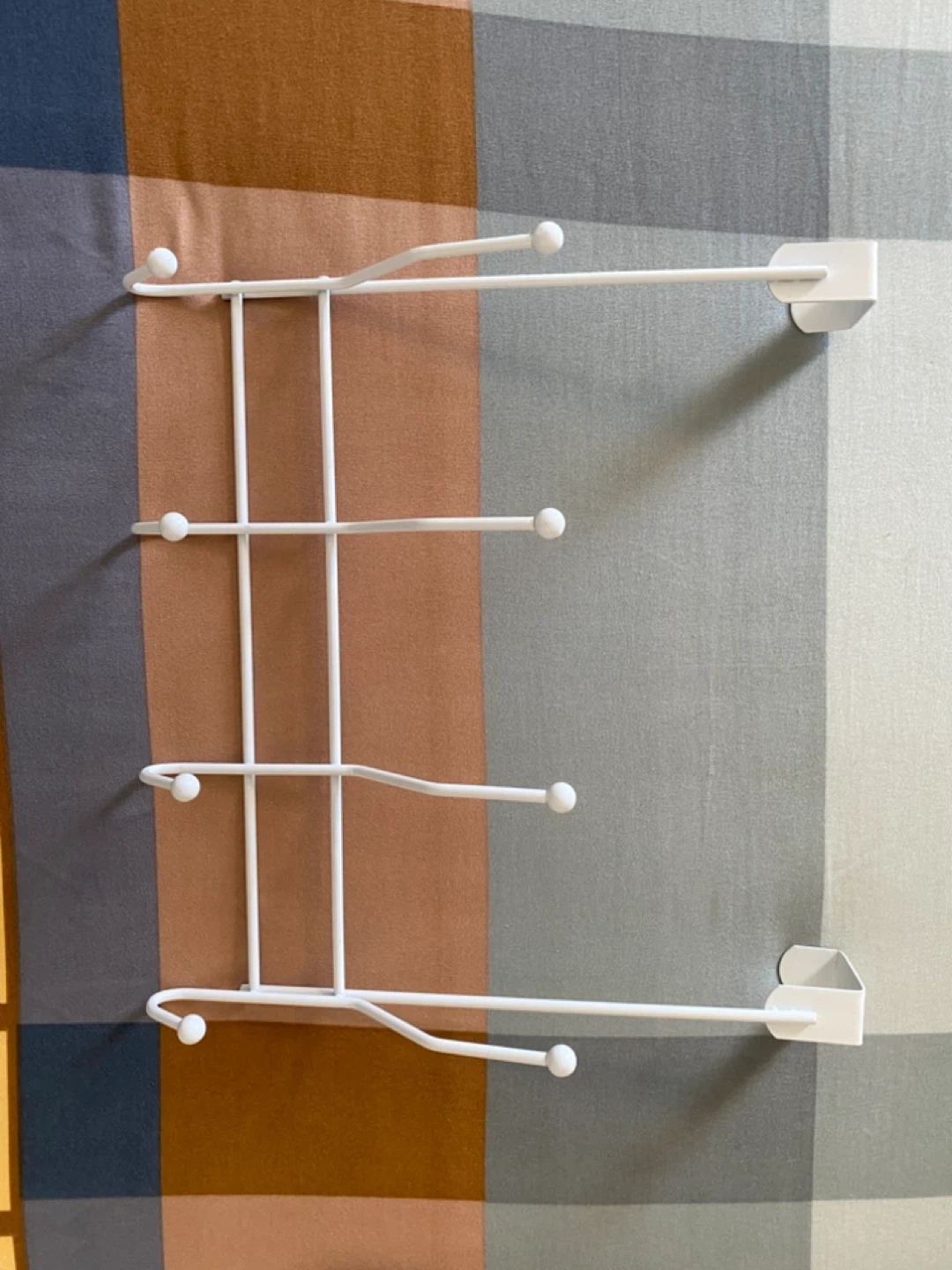 A white metal wall rack designed for hanging items. It features four extended hooks, each with a rounded end. This rack is great for organizing scarves, belts, or accessories in any room.