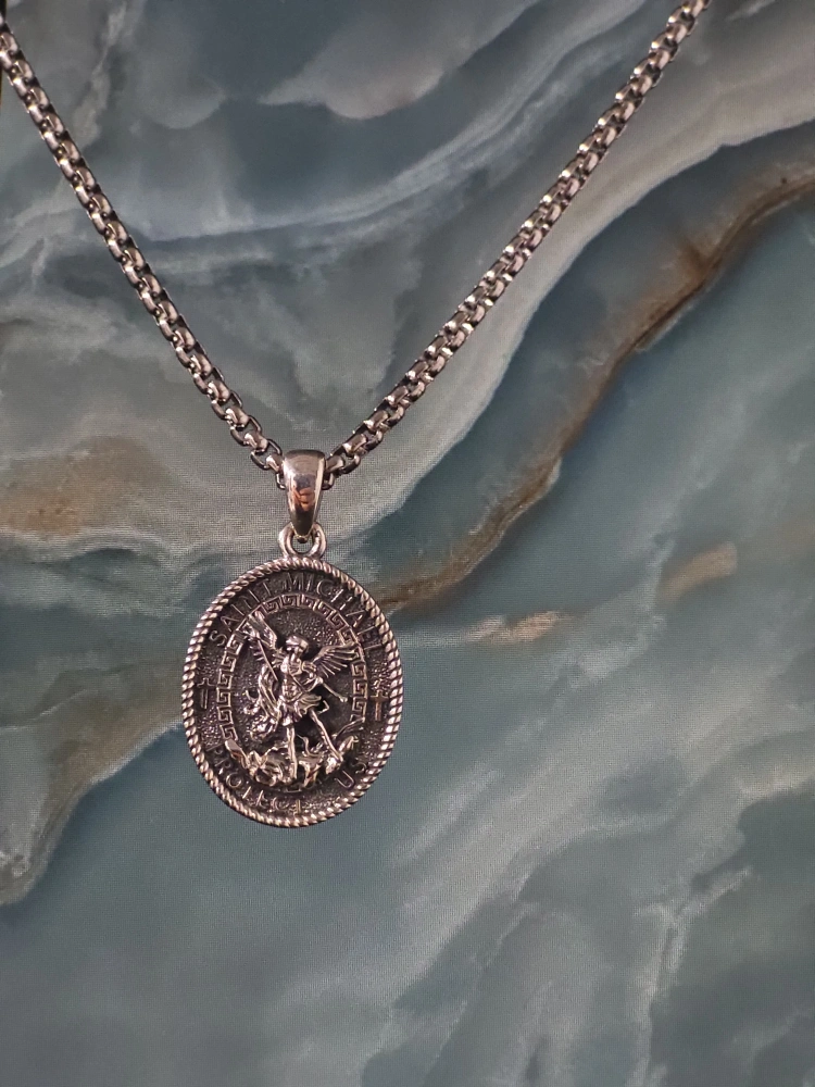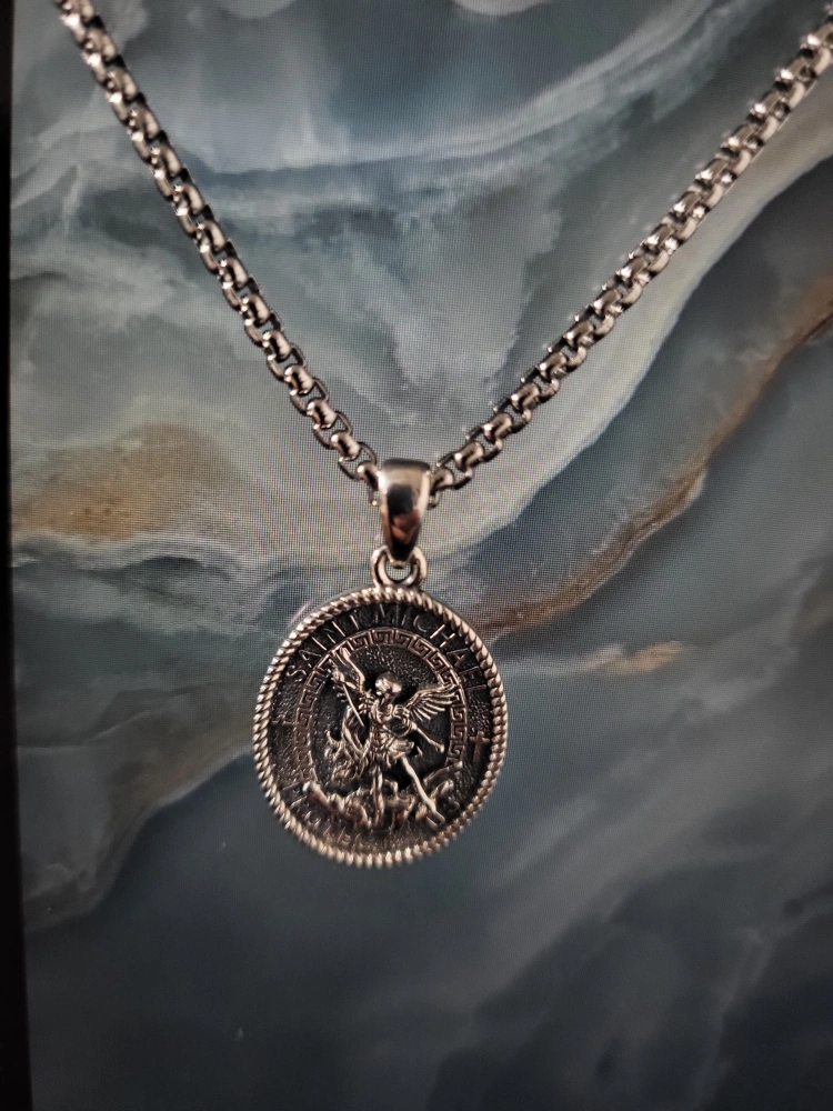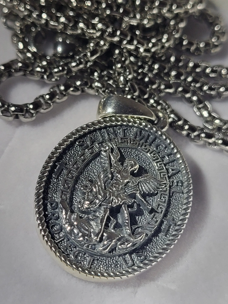 Silver 925 chain and pendant. Round pendant features Saint Michael the Archangel. Back of pendant engraved with Psalm 91. Looks great!