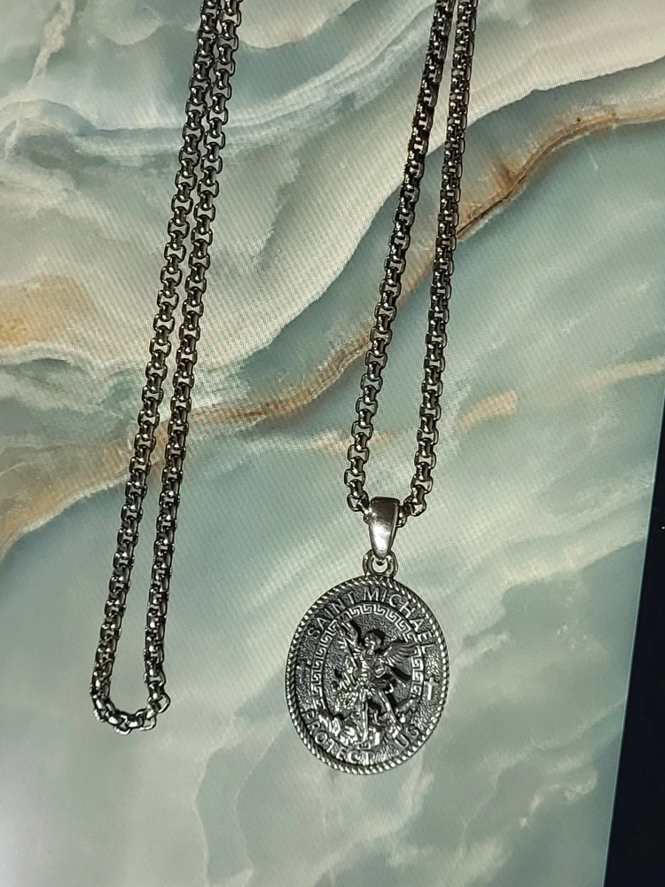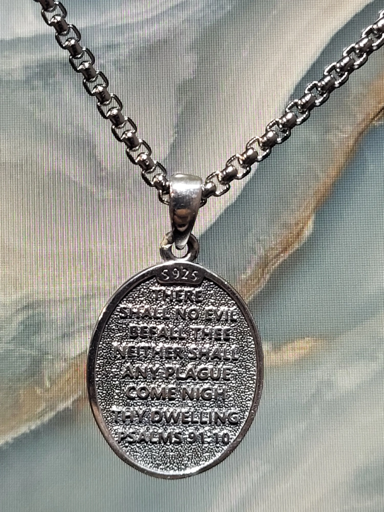 Silver 925 chain and pendant. Round pendant features Saint Michael the Archangel. Back of pendant engraved with Psalm 91. Looks great!