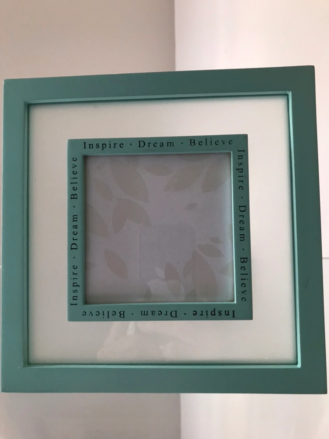 A lovely teal coloured picture frame with the words 'Inspire, Dream, Believe' inscribed on the inner frame. Perfect for displaying your cherished memories! CASH ONLY