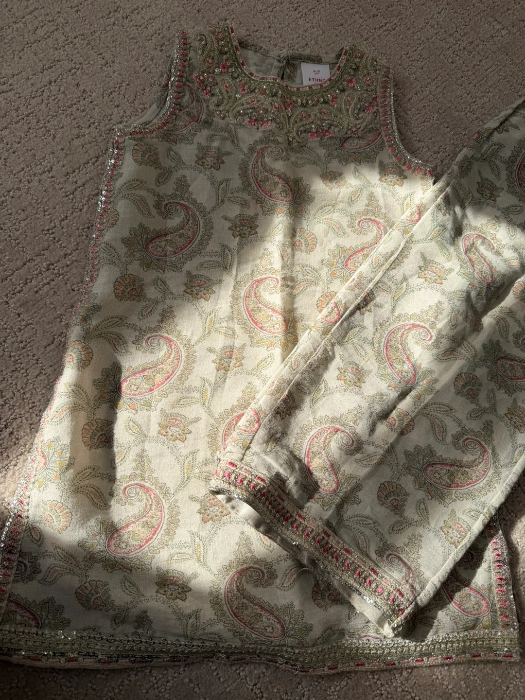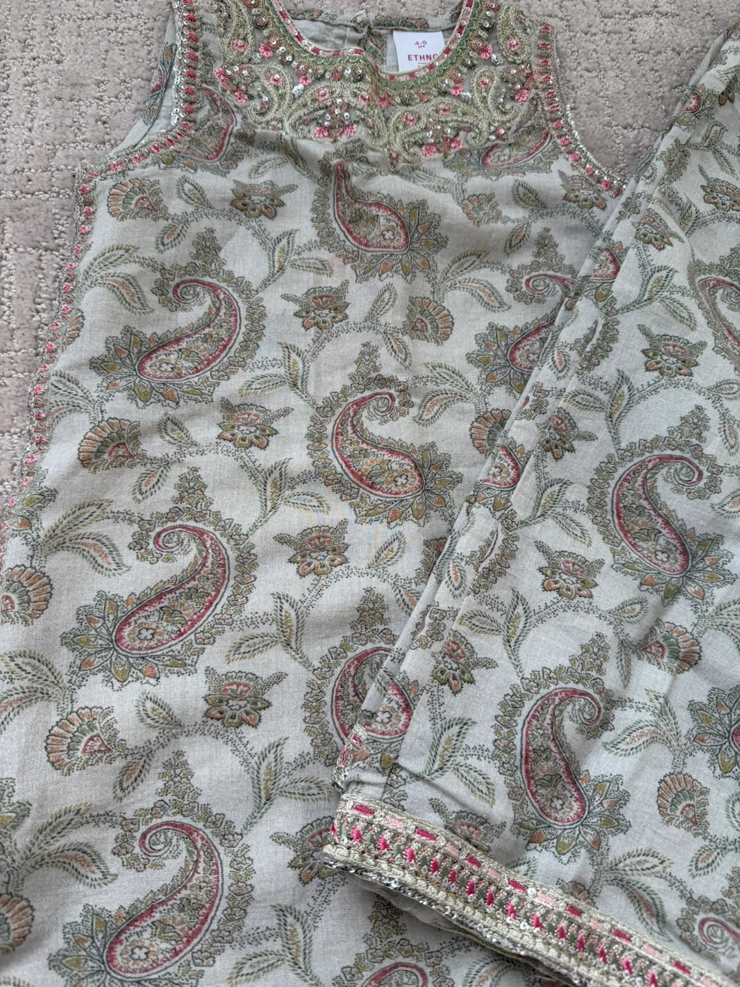 This Ethno kurta and pants set features a delicate pink paisley print. It's embellished with beads and sequins around the neckline and hem. Size is 4-5 years.