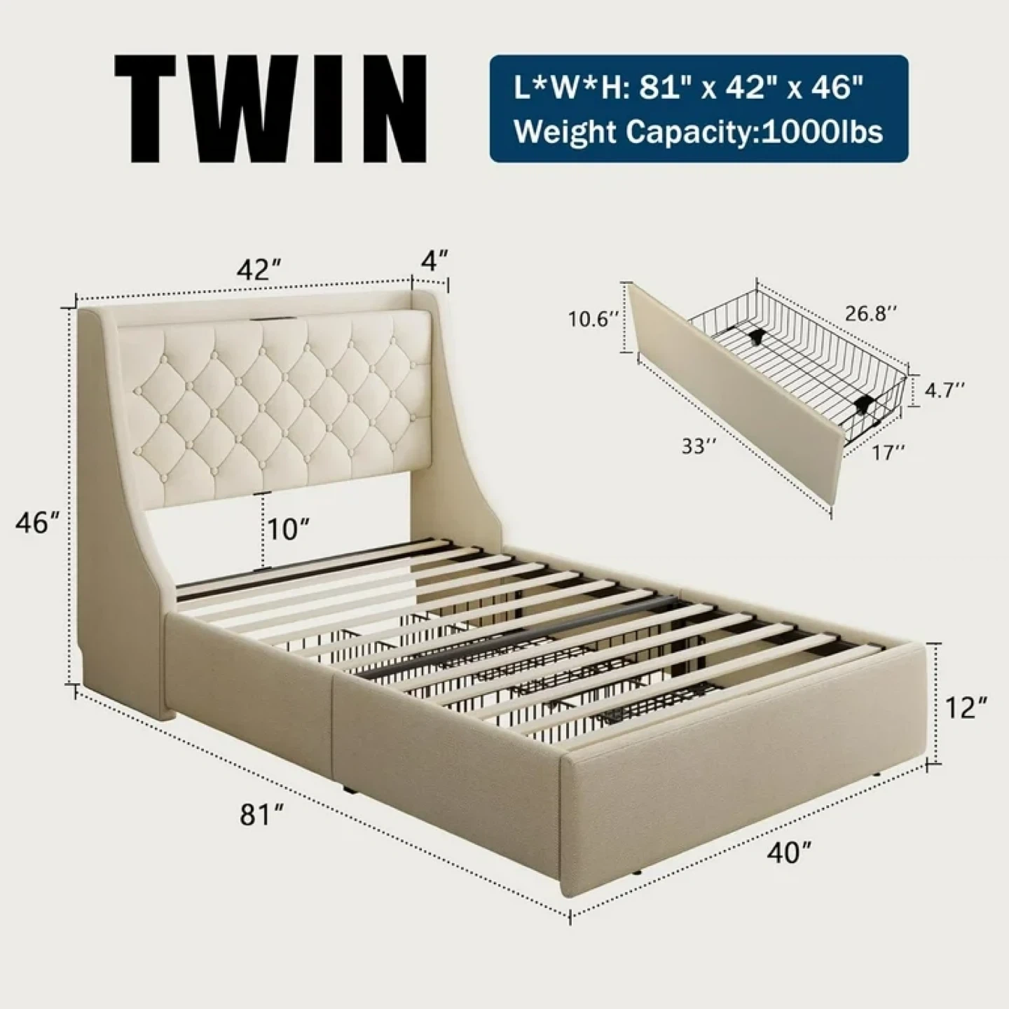Multifunctional Aesthetic Wingback: 14" giant wingback prevents mattress sliding and greatly improve the stability of bed frame. Leaving enough space for nightstands, easily using drawers by the headboard