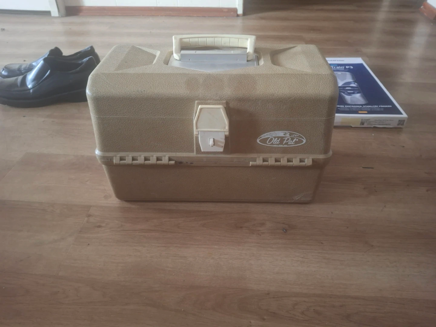 This is a vintage Old Pal tackle box. It's a tan coloured plastic box with multiple compartments for organizing fishing gear. This box is great for storing lures, tools, and other fishing accessories.