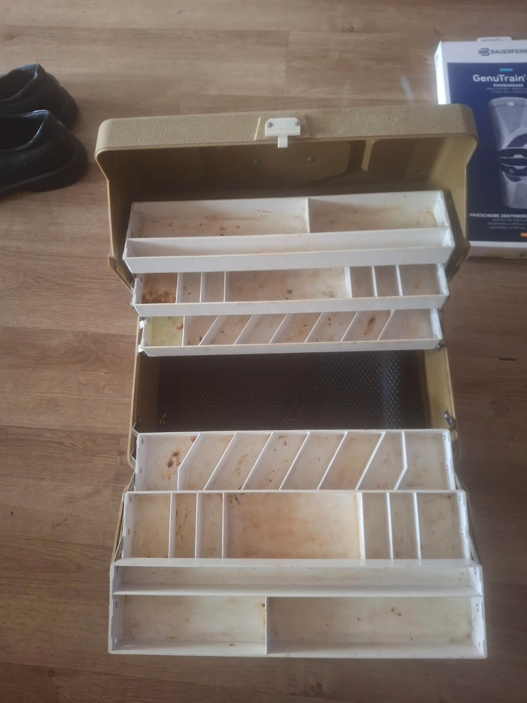 This is a vintage Old Pal tackle box. It's a tan coloured plastic box with multiple compartments for organizing fishing gear. This box is great for storing lures, tools, and other fishing accessories.