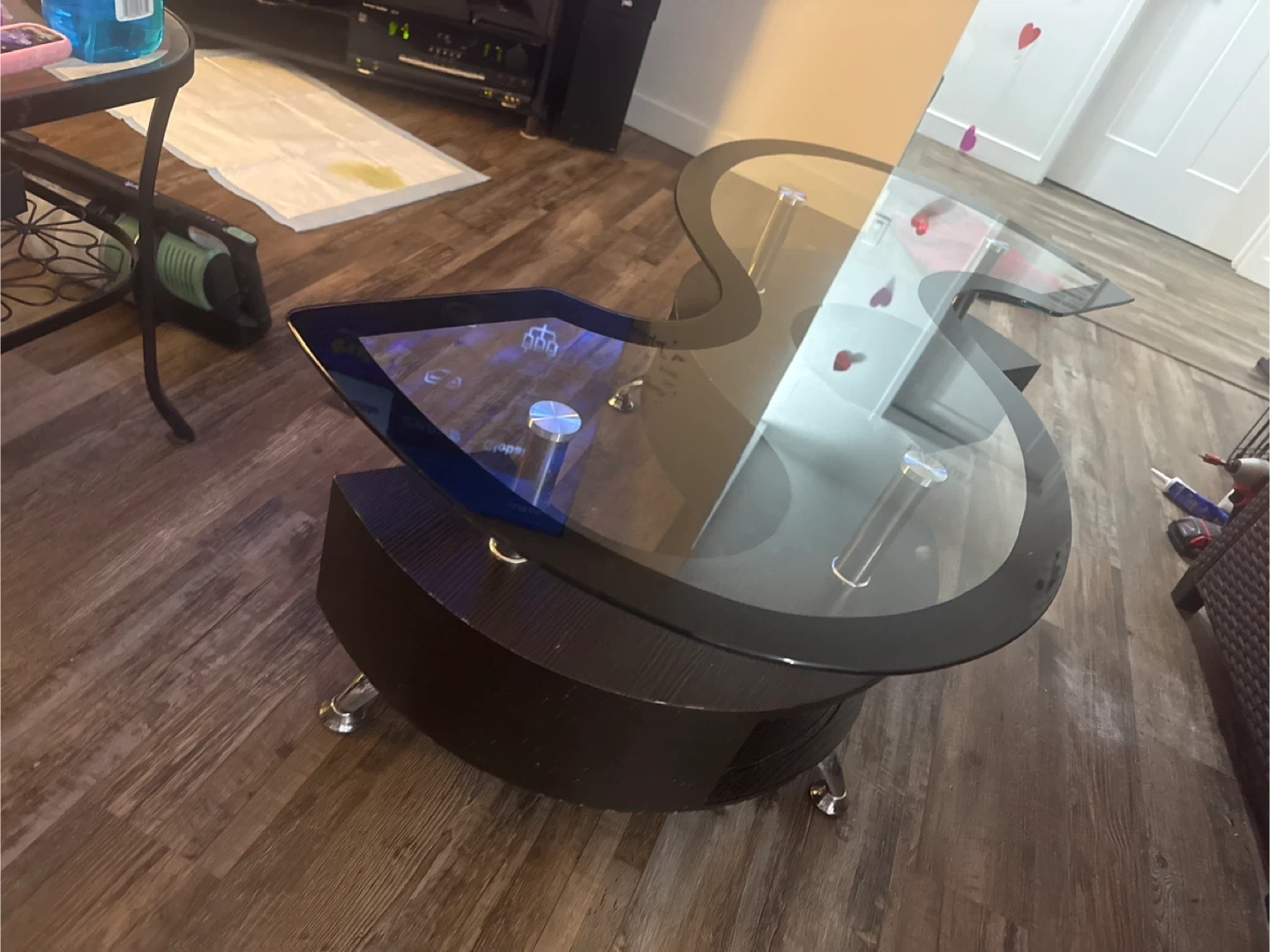 This S-shaped coffee table features a sleek glass top and a dark wood base. It offers a unique design with ample surface area. Its distinctive shape makes it a stylish focal point for any living room!