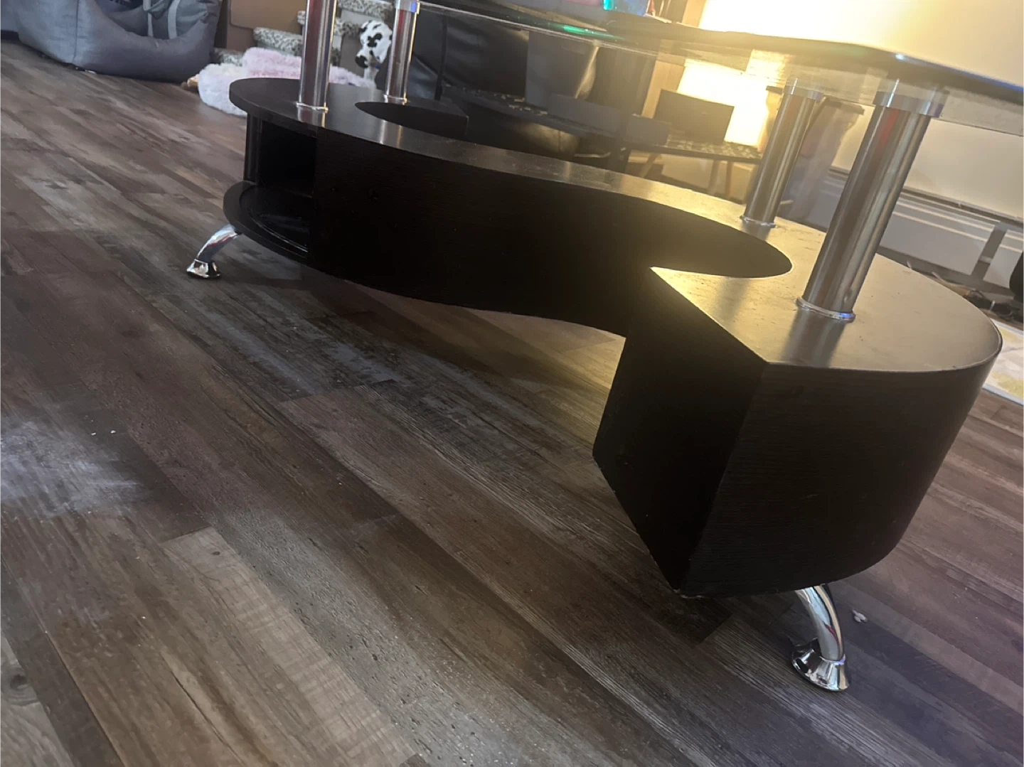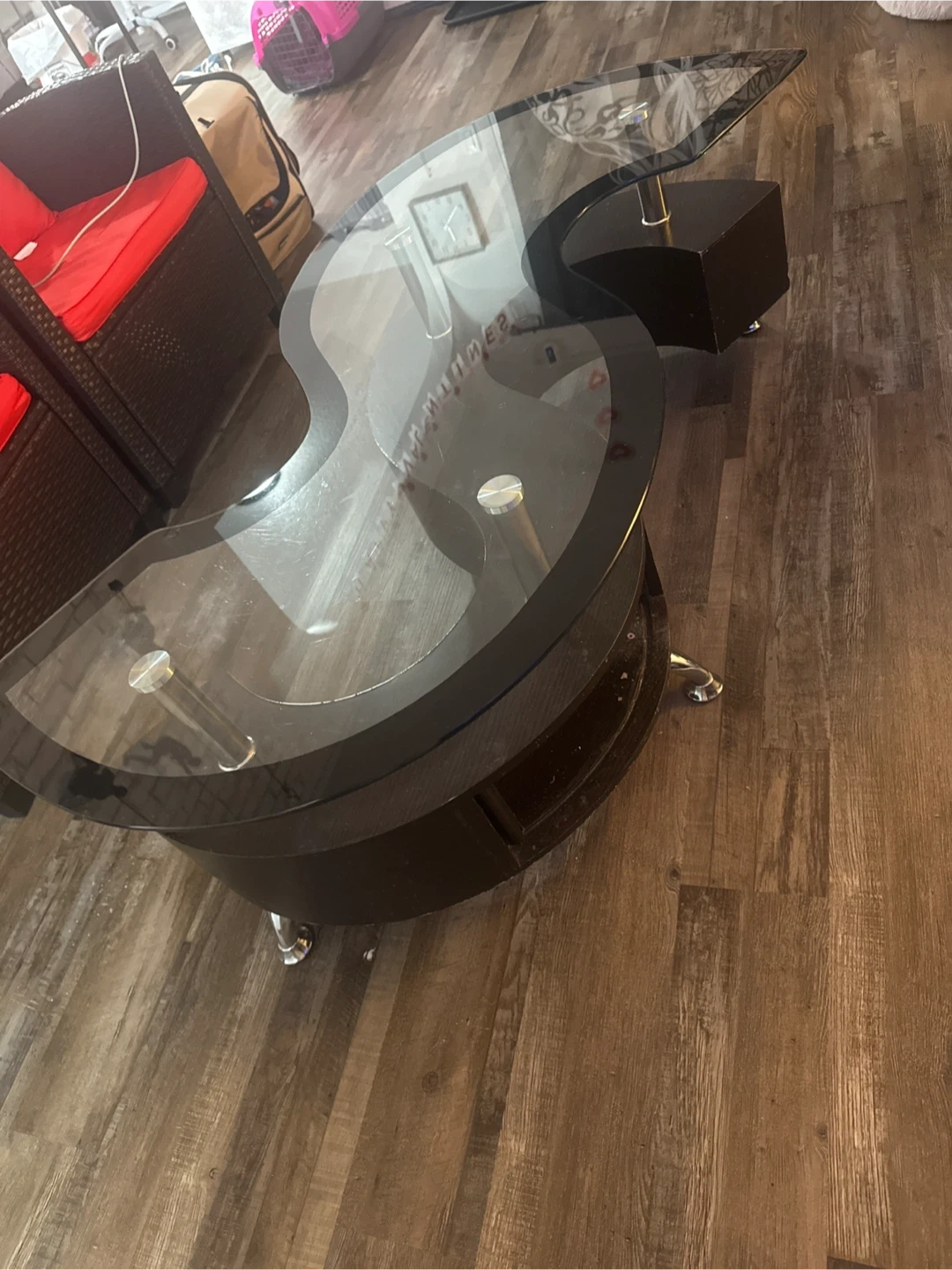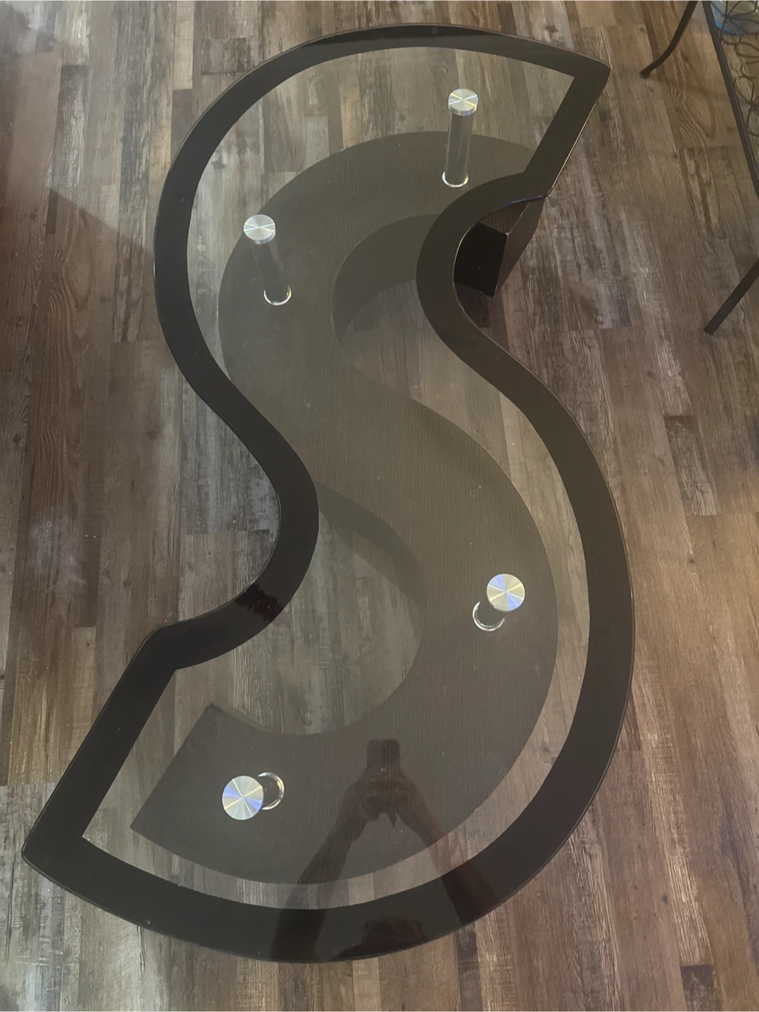 This S-shaped coffee table features a sleek glass top and a dark wood base. It offers a unique design with ample surface area. Its distinctive shape makes it a stylish focal point for any living room!