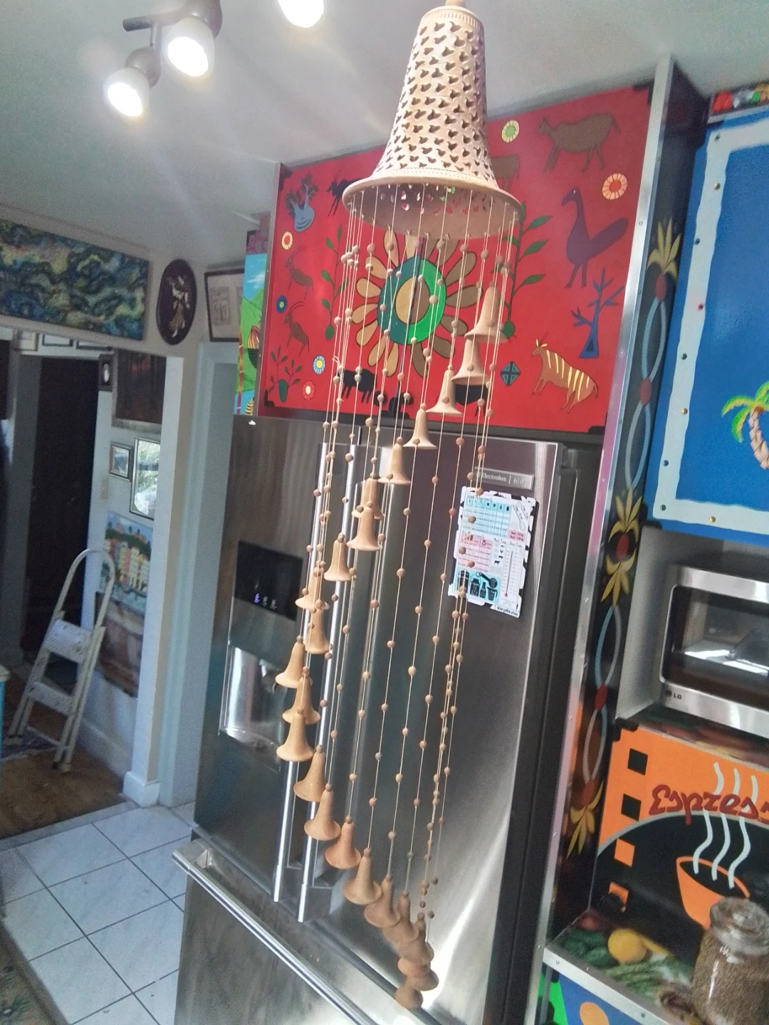 This brand new Cuban handcrafted terracotta bell wind chime is a beautiful addition to any home. Measuring 45 inches in length, it features intricate detailing and a unique design, bringing a touch of artistry and tranquility to your space.