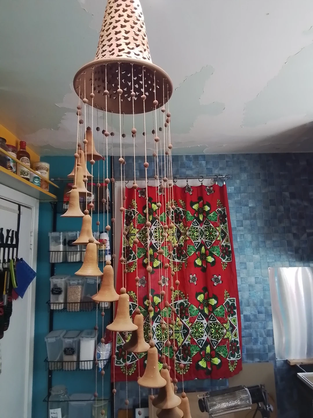 A vintage-style Cuban handcrafted ceramic wind chime features a distinctive decorative bell-shaped top with intricate cutouts and a series of smaller bells suspended below in a spiral or tiered arrangement.