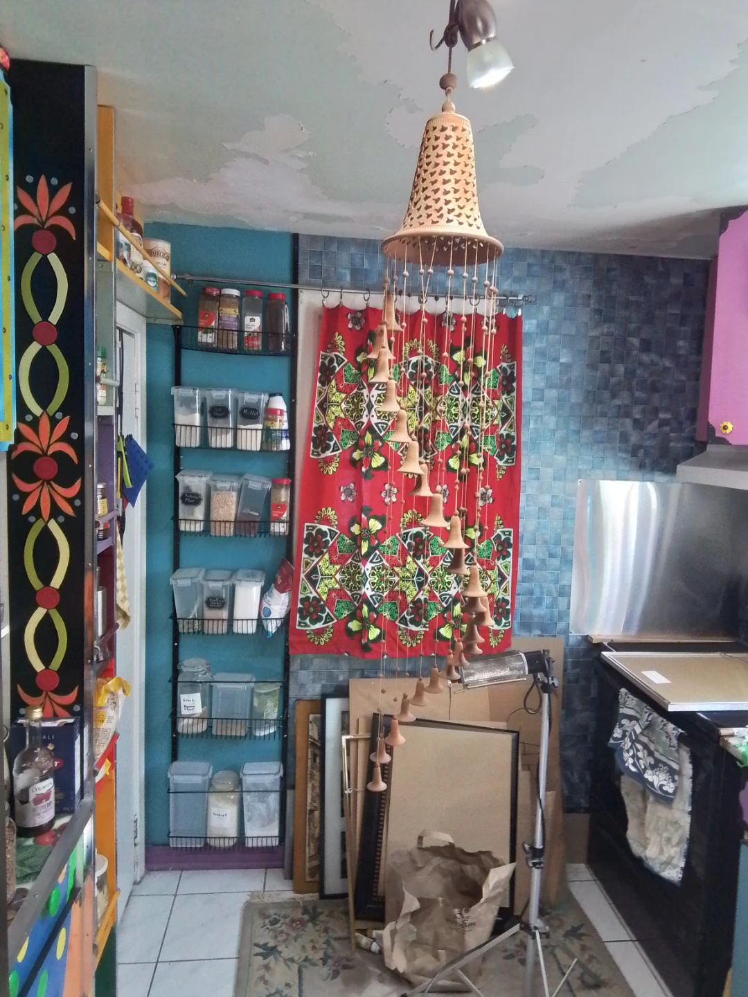 A vintage-style Cuban handcrafted ceramic wind chime features a distinctive decorative bell-shaped top with intricate cutouts and a series of smaller bells suspended below in a spiral or tiered arrangement.