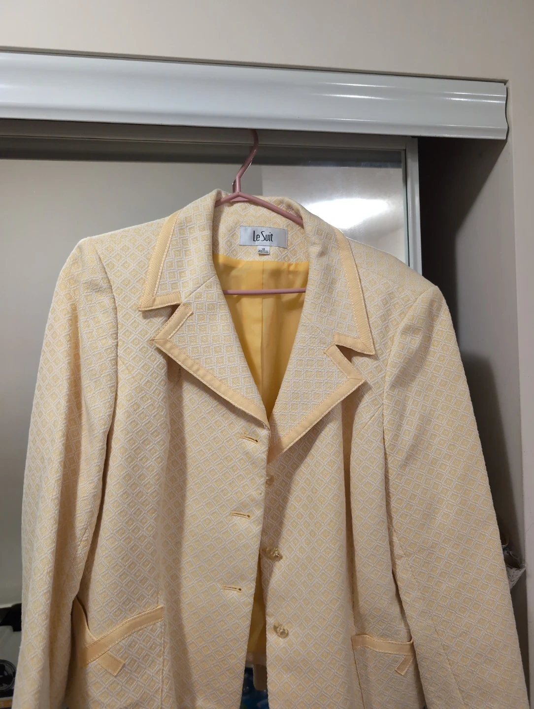 This Le Suit blazer is a lovely light yellow with a textured diamond pattern. It features a classic lapel and button front closure. The lining is a bright yellow satin. Size 18
